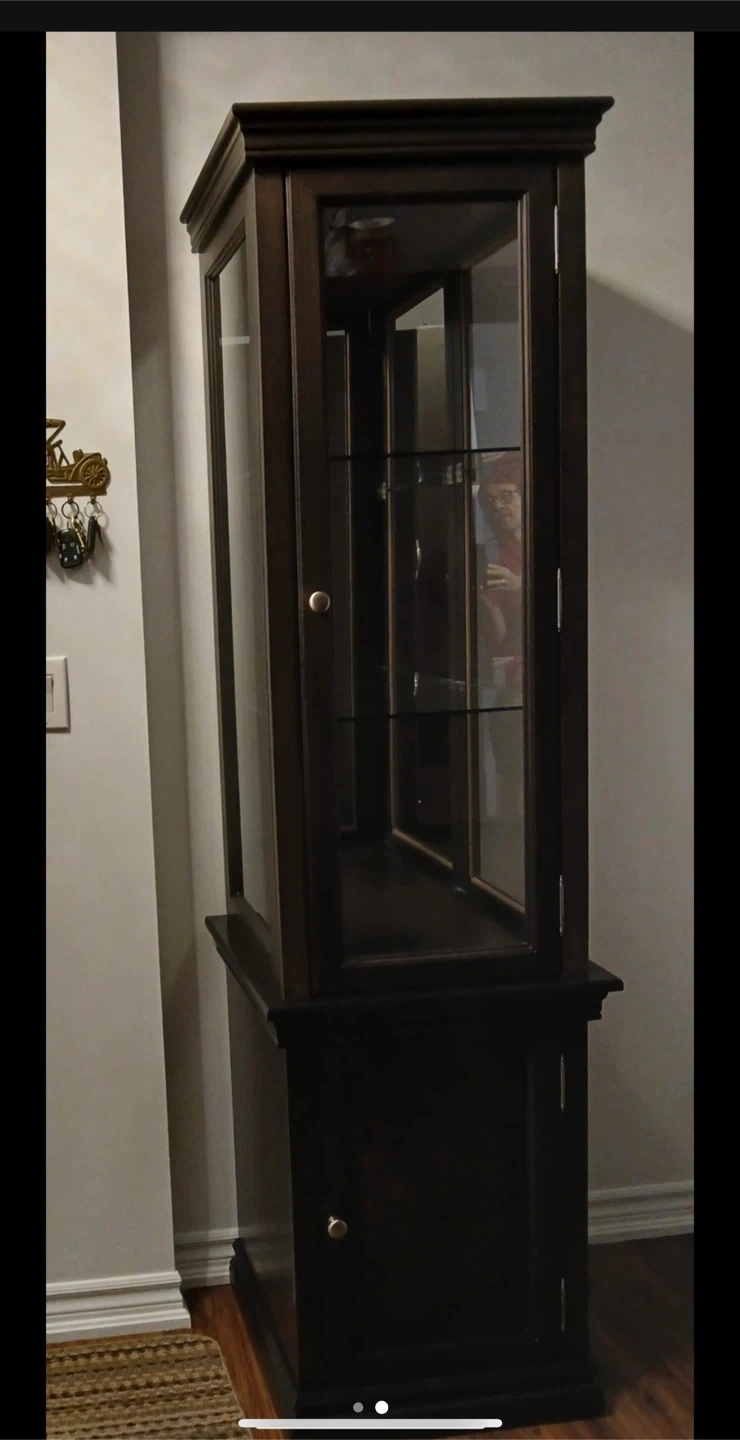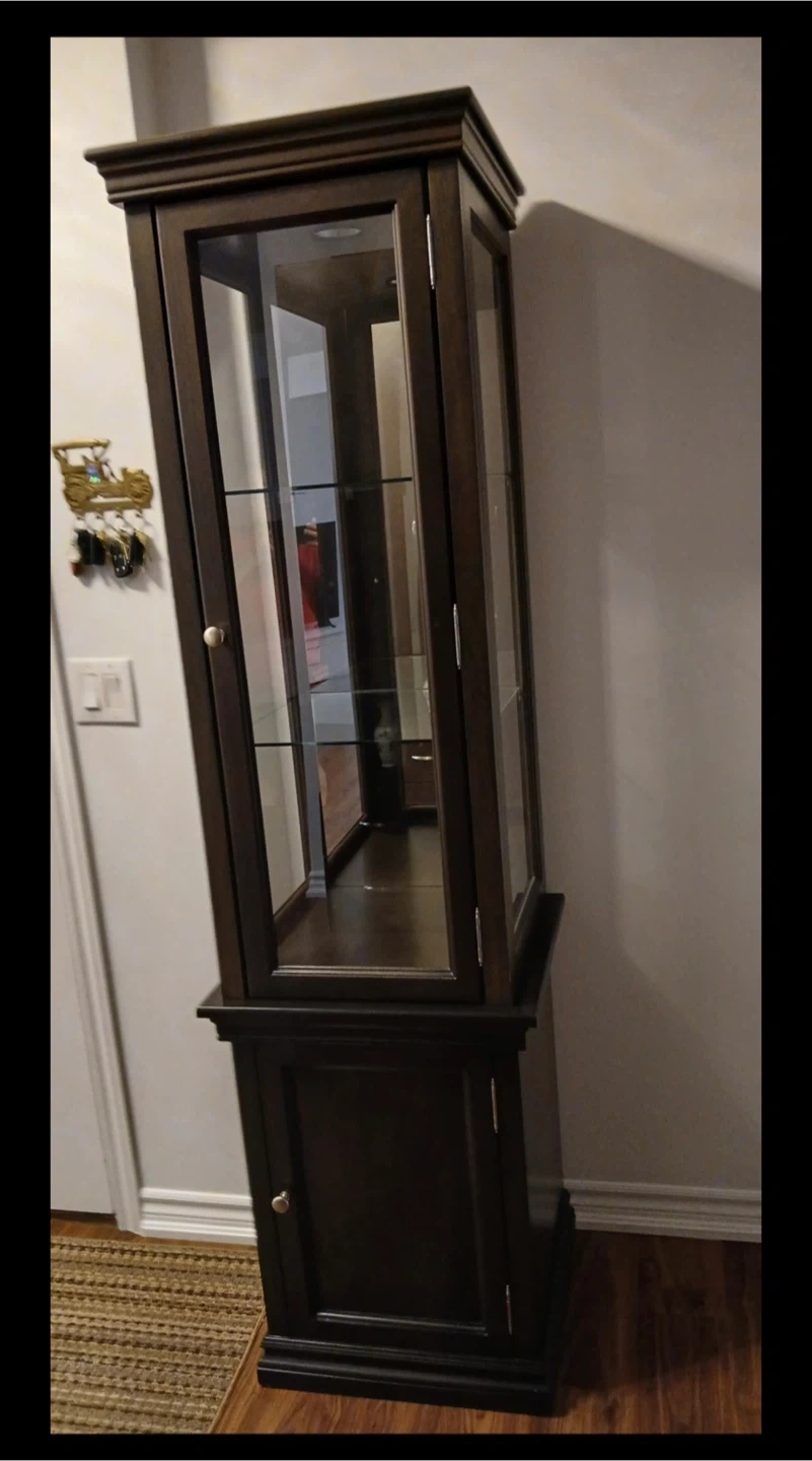 Selling a dark brown(espresso) display cabinet in great condition. It's perfect for showcasing your favourite items. It features glass shelves and a cabinet at the bottom for extra storage.