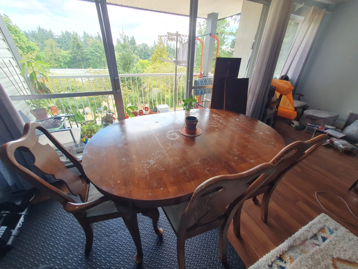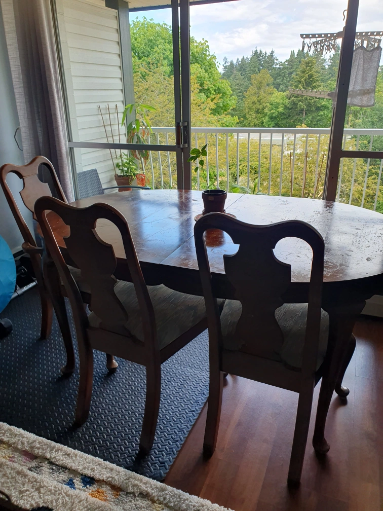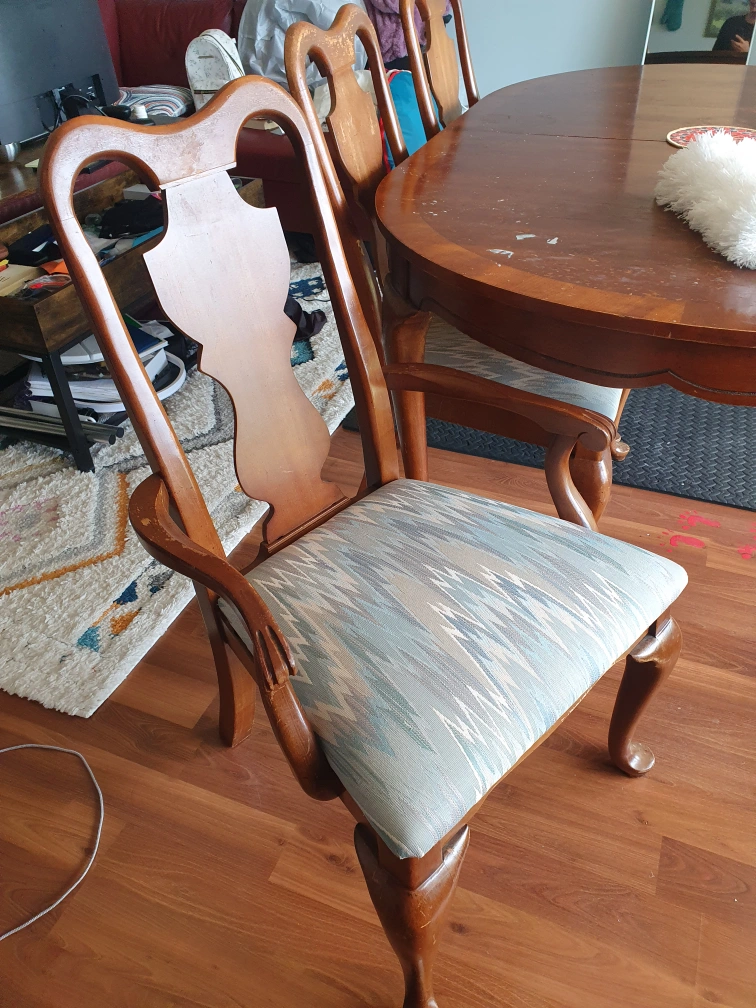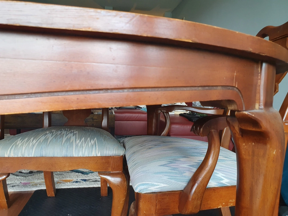 This is a solid wood dining table that extends to comfortably seat 8–10 people – great for big family dinners or gatherings. Extra wood planks can be added to make it even longer. Includes 6 sturdy chairs that have been freshly cleaned using an upholstery/carpet extractor (the kind that sprays water and sucks it back up). The chairs have a timeless wooden frame and patterned turquoise cushions for a warm, cozy look. Now, full transparency: the table surface is worn and definitely needs a full refurbishing. If you're into DIY projects or enjoy bringing furniture back to life, this table has great potential. It's structurally solid – I just don’t have the carpentry skills or space for it anymore. If you're up for a fun restore project, this could turn into a stunning centerpiece for your home!