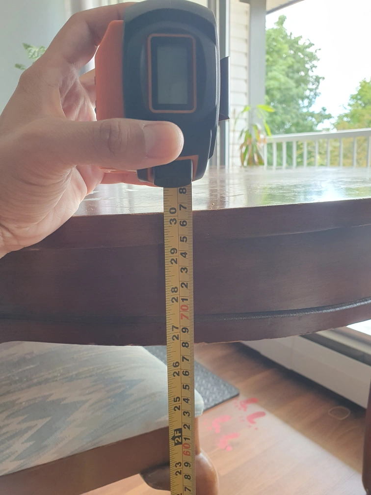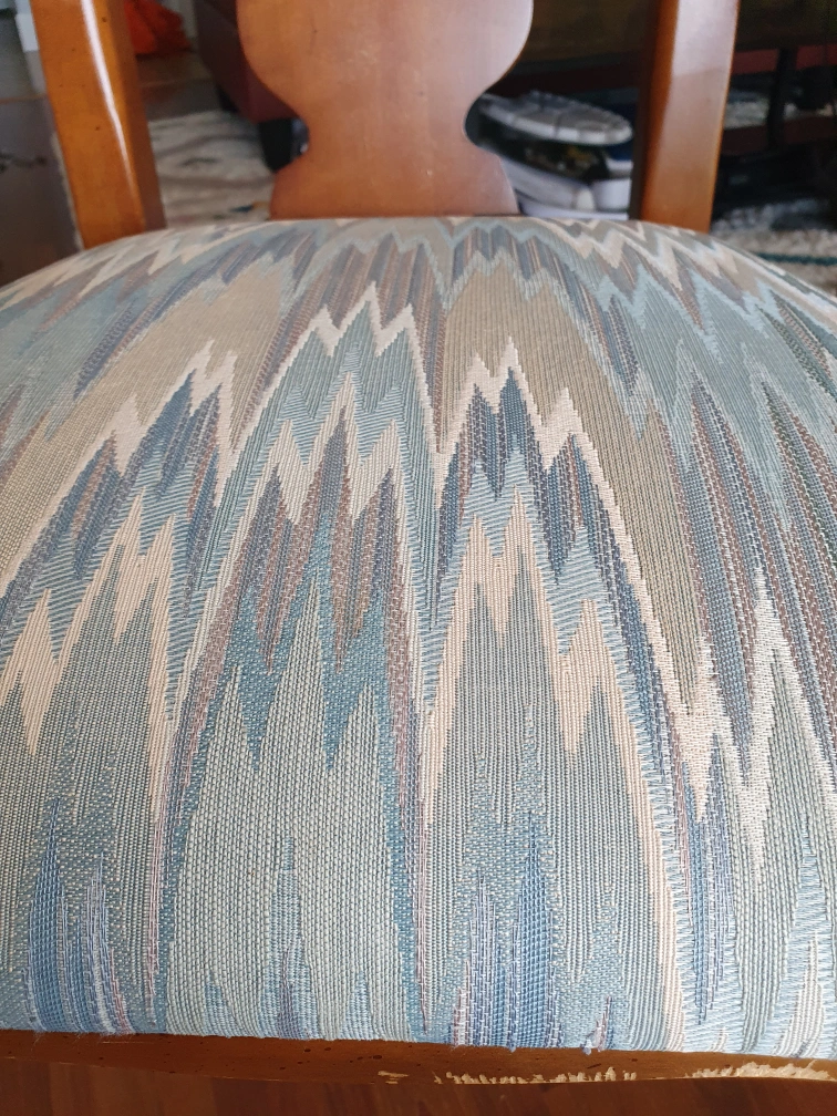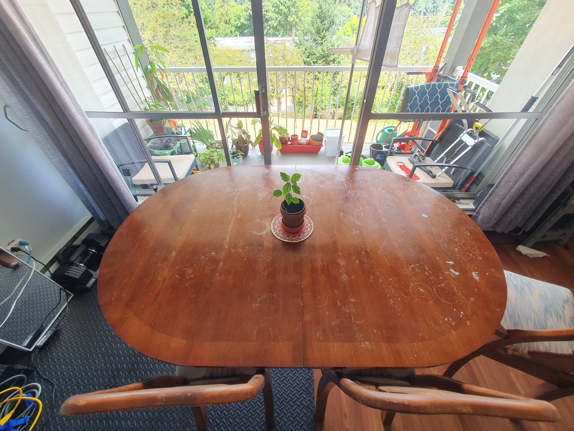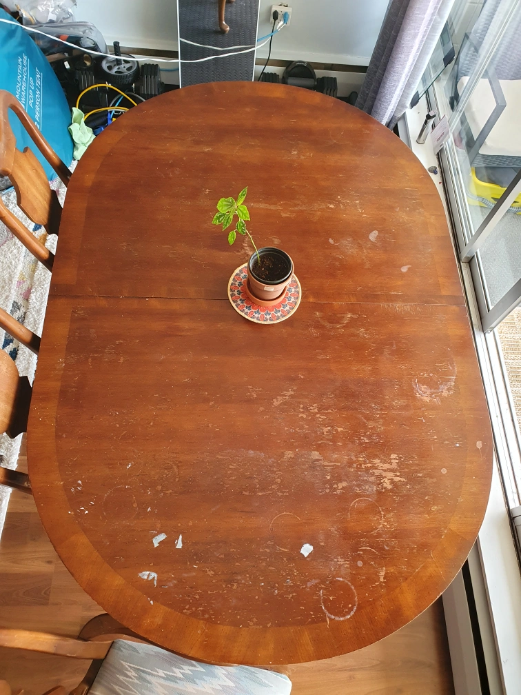 This is a solid wood dining table that extends to comfortably seat 8–10 people – great for big family dinners or gatherings. Extra wood planks can be added to make it even longer. Includes 6 sturdy chairs that have been freshly cleaned using an upholstery/carpet extractor (the kind that sprays water and sucks it back up). The chairs have a timeless wooden frame and patterned turquoise cushions for a warm, cozy look. Now, full transparency: the table surface is worn and definitely needs a full refurbishing. If you're into DIY projects or enjoy bringing furniture back to life, this table has great potential. It's structurally solid – I just don’t have the carpentry skills or space for it anymore. If you're up for a fun restore project, this could turn into a stunning centerpiece for your home!
