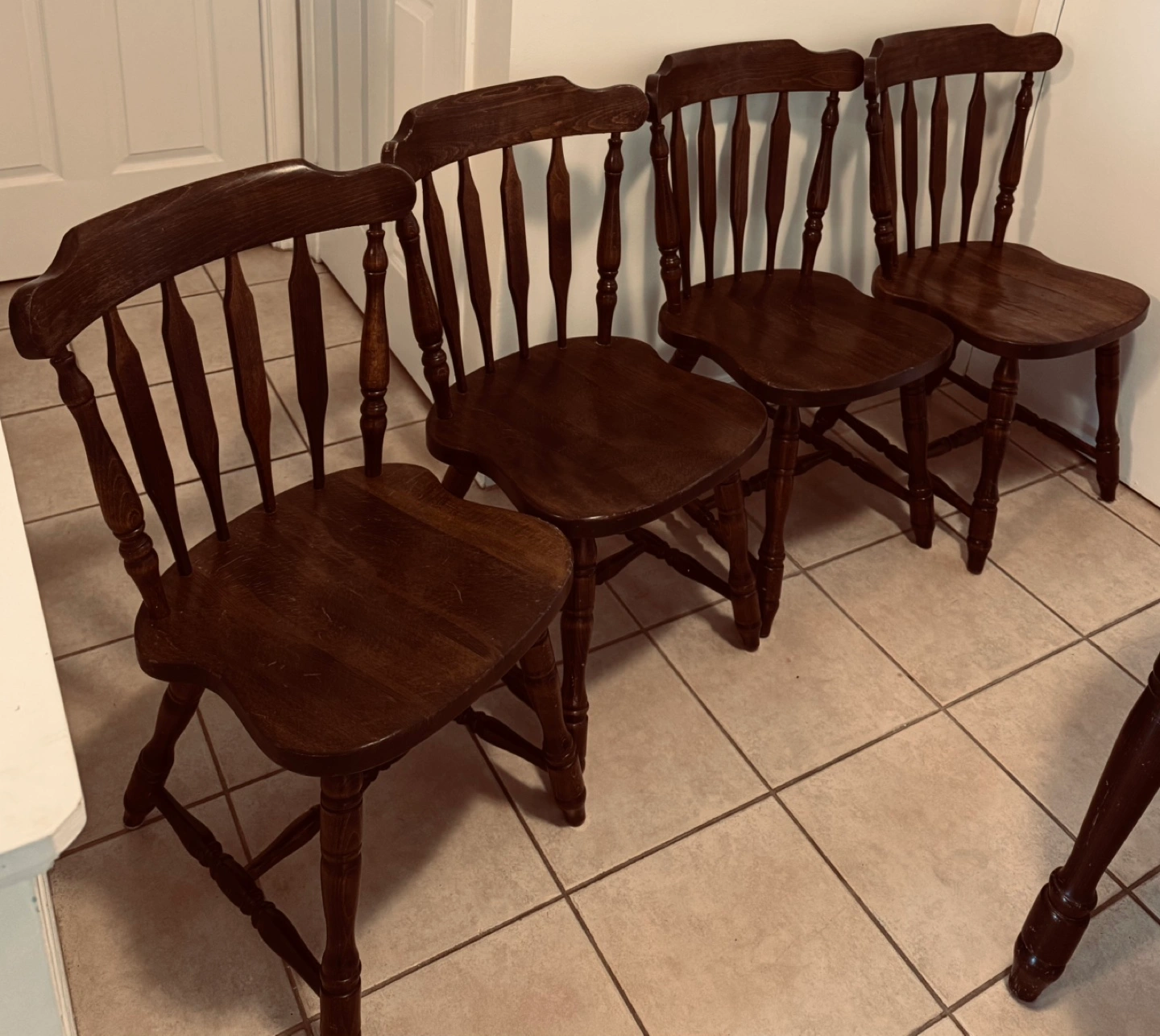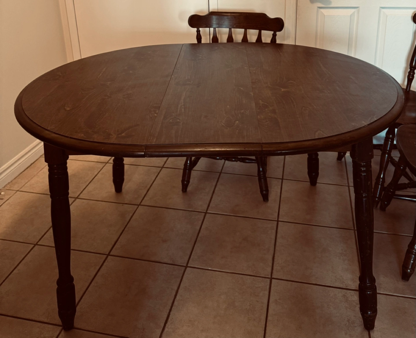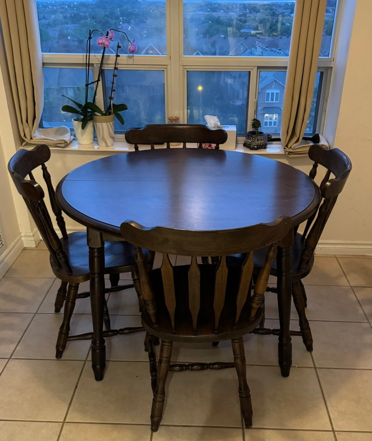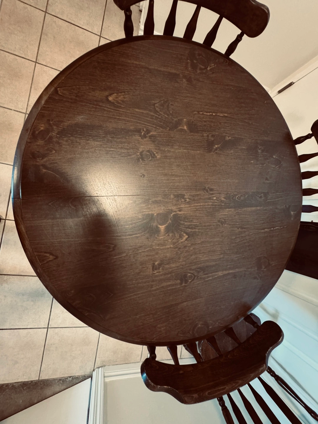 Selling a round dining table with extension and four chairs. It's a great set for a smaller dining space or kitchen nook. The table and chairs have a classic, timeless look. Perfect for family meals or entertaining friends! Table diameter: 40 inches Extension adds 12 inches