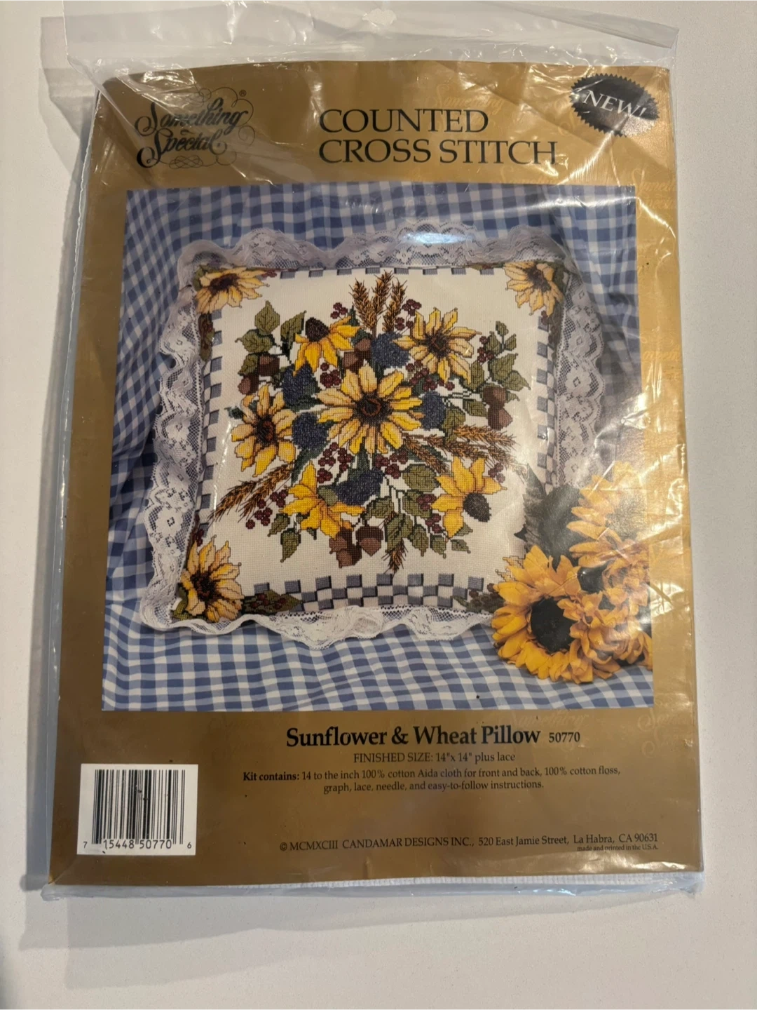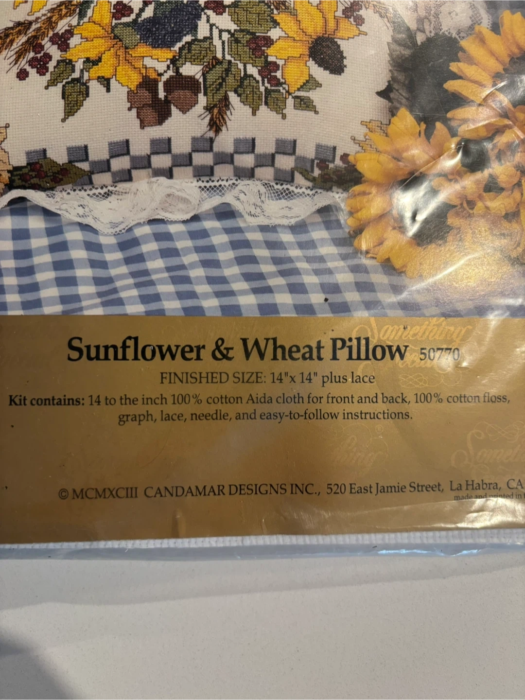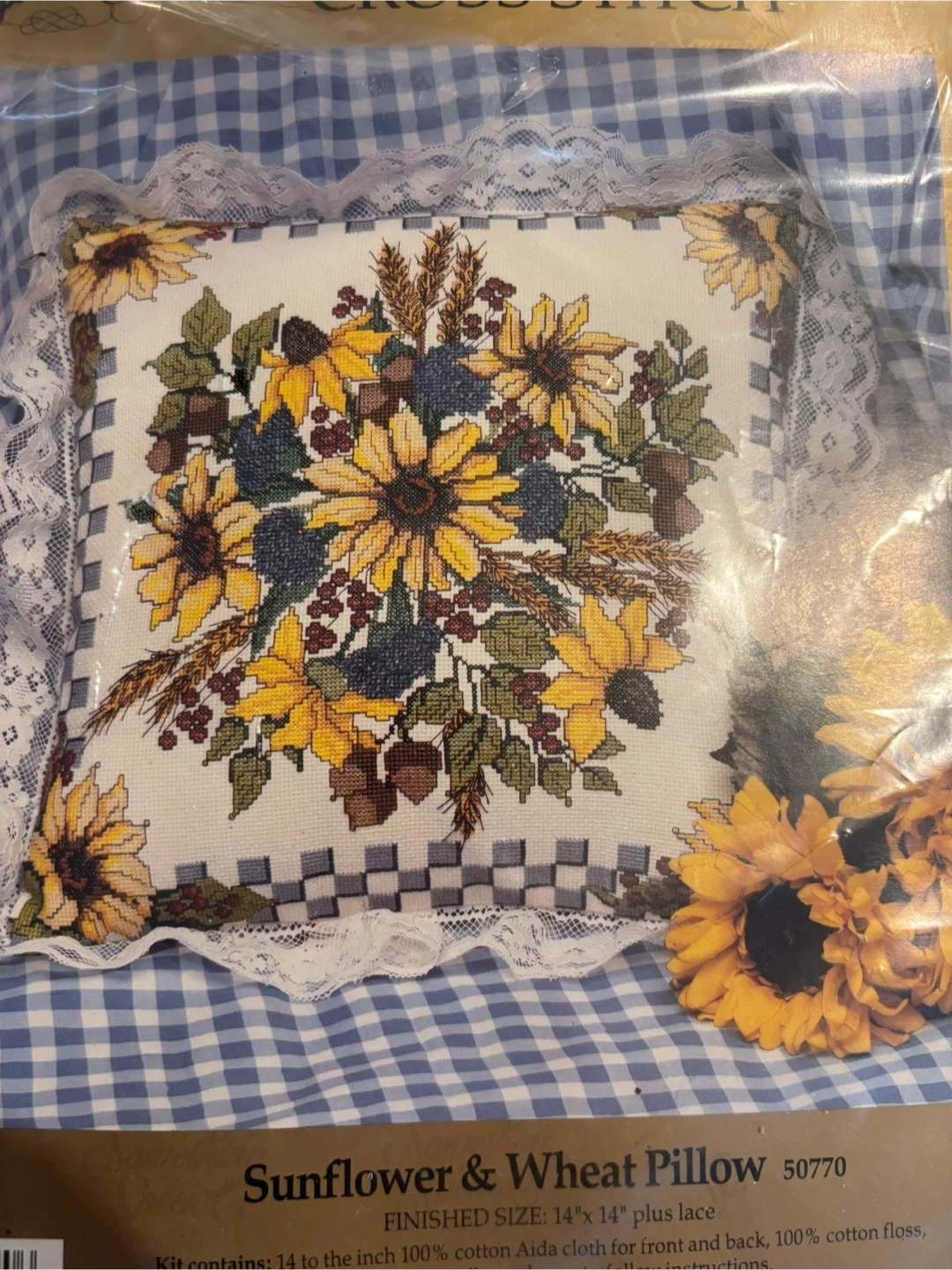 Brand New - Something Special Sunflower & Wheat Pillow Needlepoint Kit For Sale. Brand new - still in original packaging. Finished size: 14” x 14” plus lace. Kit contains: cotton cloth, cotton floss, graph, lace, needle, and instructions. $40 firm. East Regina pick up. Listed on other sites.
