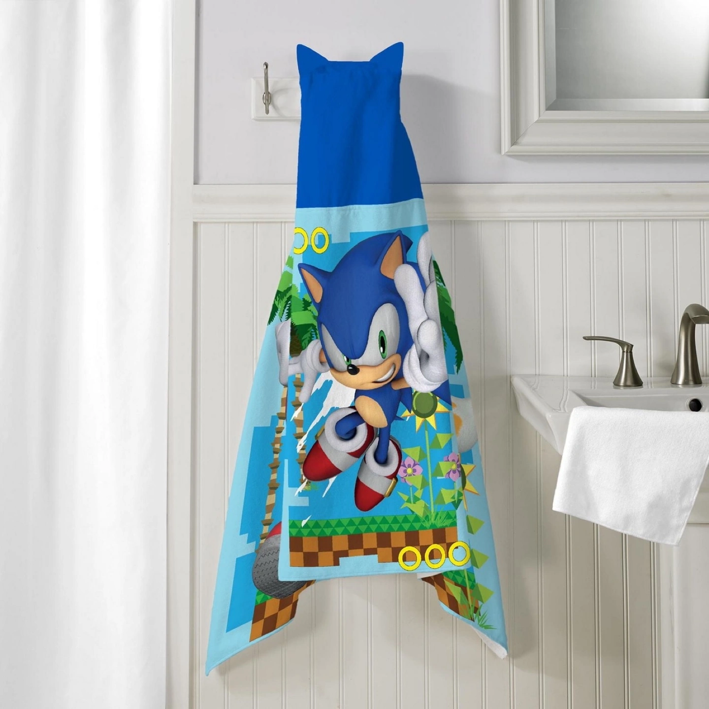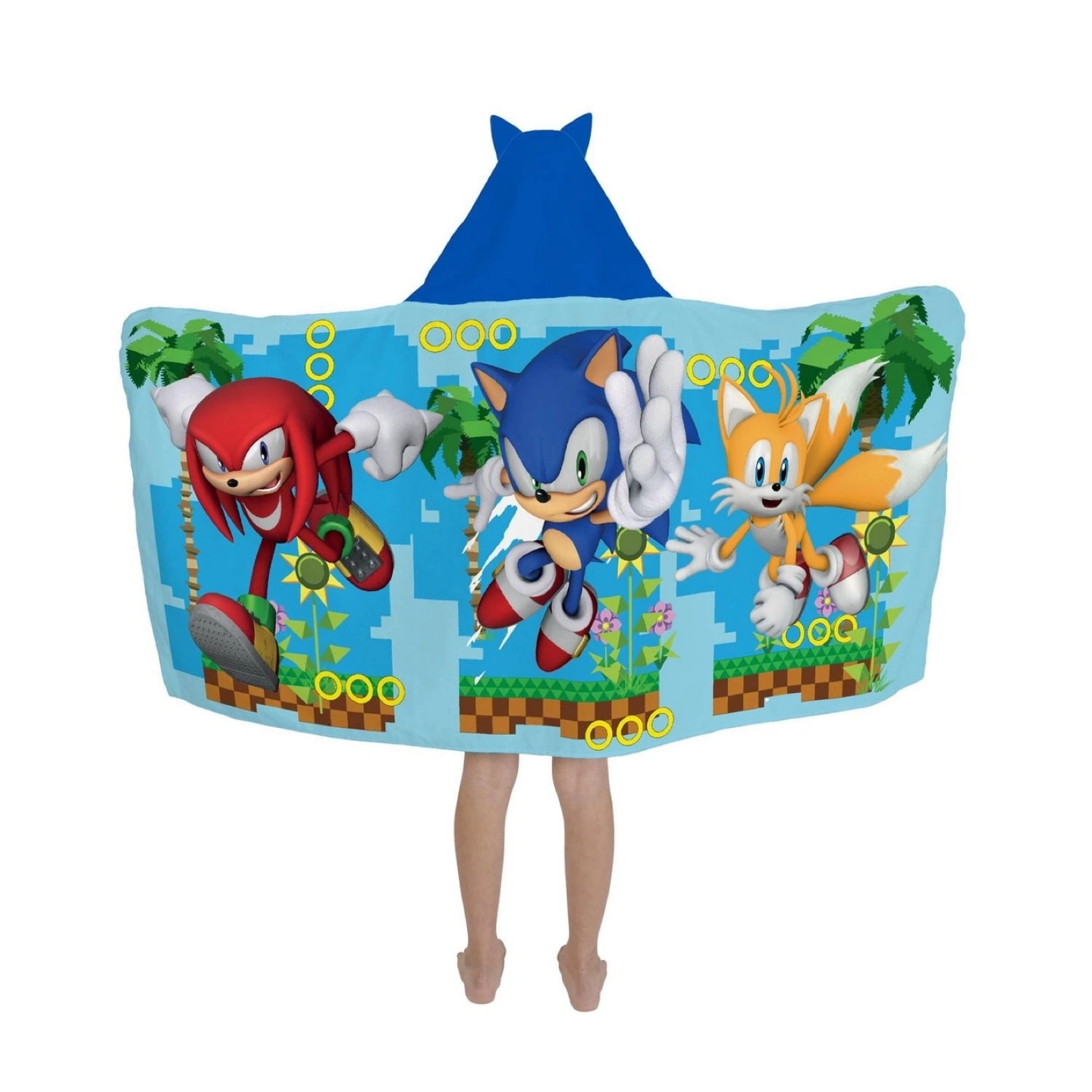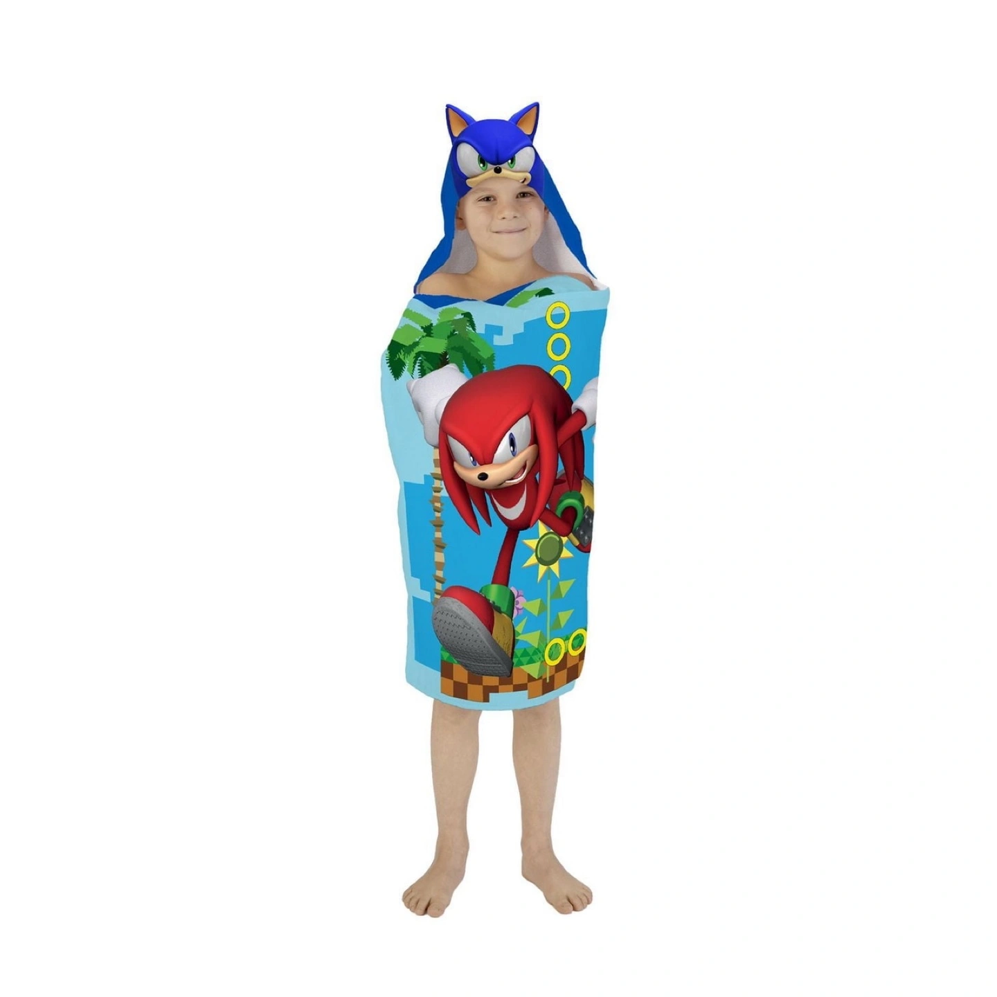 Kids hooded bath towel. Features Sonic, Tails, and Knuckles. Blue hooded towel with a fun design. Perfect for bath time.