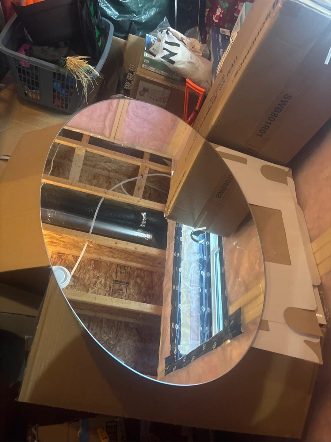 Selling a round mirror by Sonosics. It's in great condition and ready to brighten up your space! The mirror is round and has a sleek, modern look