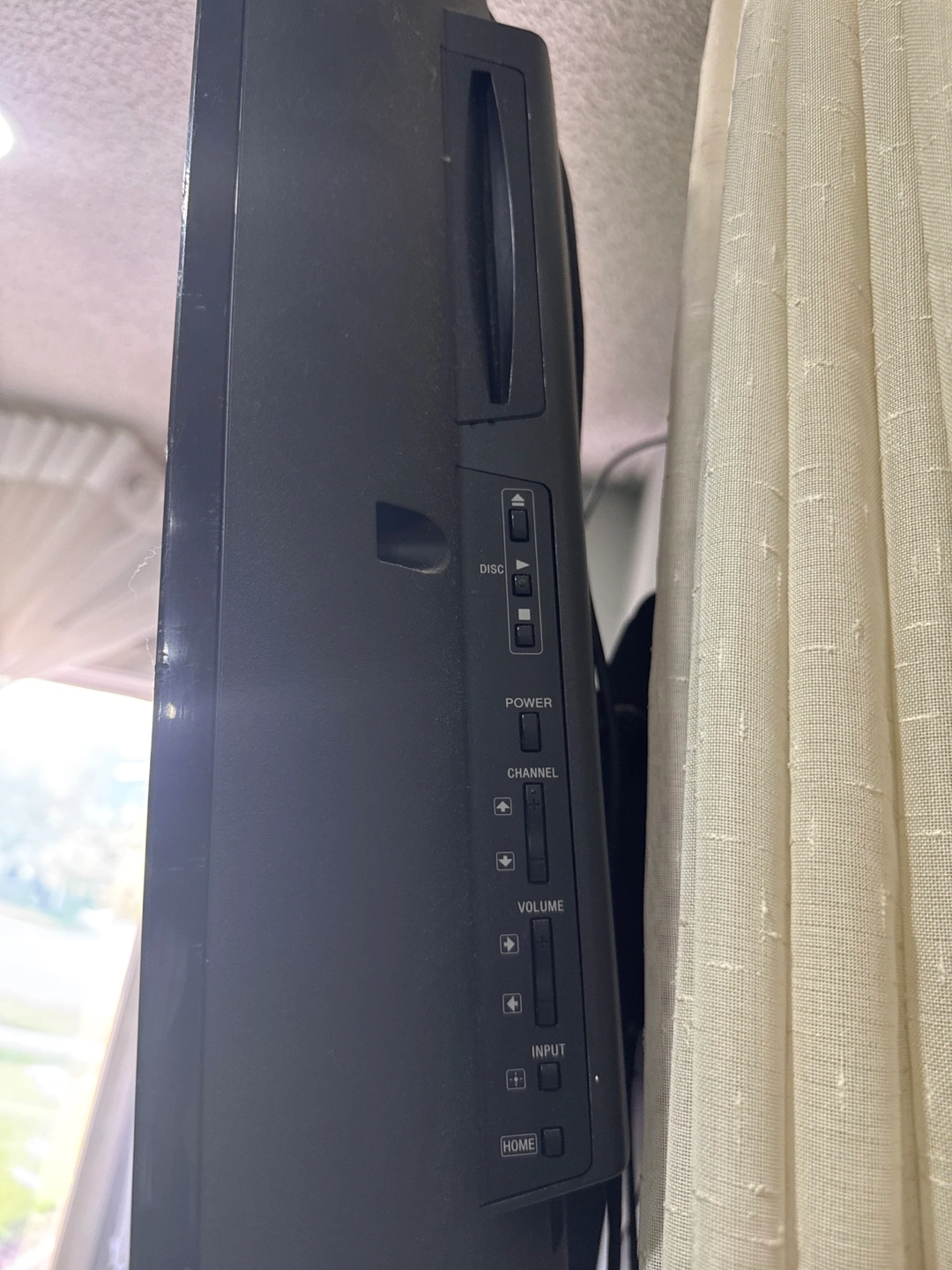 Dark colour television, with a remote control not included. Side buttons for navigation are present. You'll love watching your favourite movies and shows with this television.