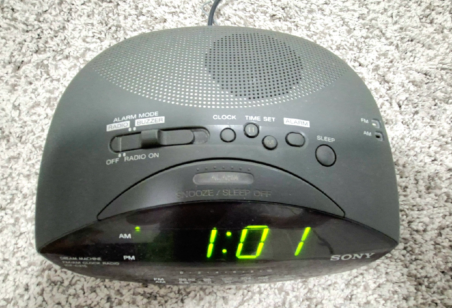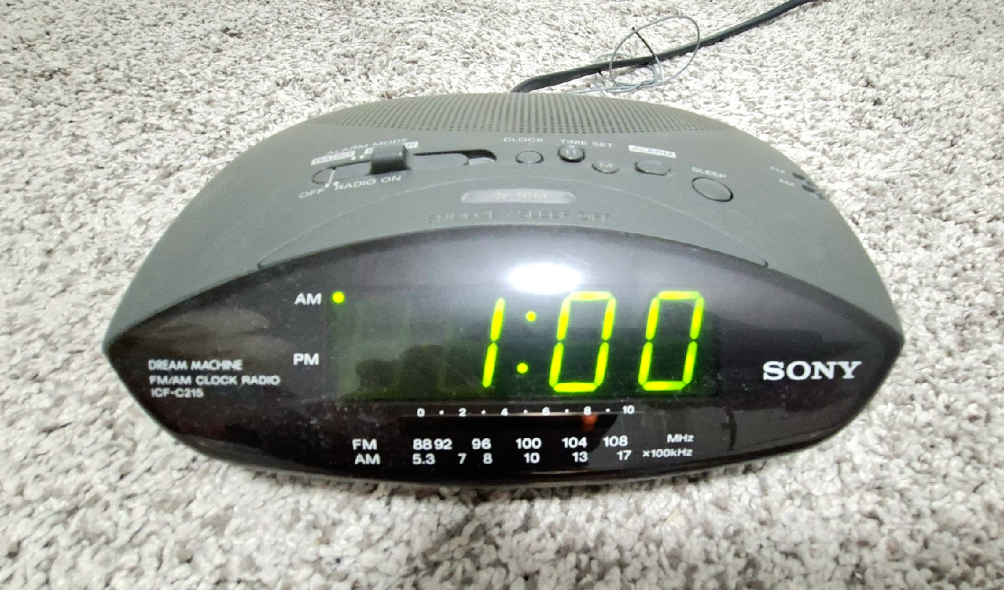 Selling a Sony Dream Machine FM/AM Alarm Clock Radio, model ICF-C218. This clock radio features both FM and AM bands, and it's in good working condition. It has a digital display and alarm function for waking up to your favourite radio station or a buzzer. Perfect for your bedside table!