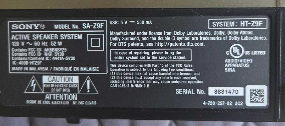 Selling a Sony HT-Z9F soundbar system. Includes the SA-Z9F subwoofer. This system delivers amazing sound quality for your home theatre setup. It's in great condition and ready to enhance your listening experience! Dolby Atmos and Dolby Surround sound are trademarks of Dolby Laboratories.