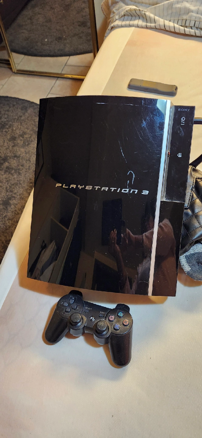 Selling a used PlayStation 3 (PS3) console. It comes with a controller. There are some scratches on the console.
