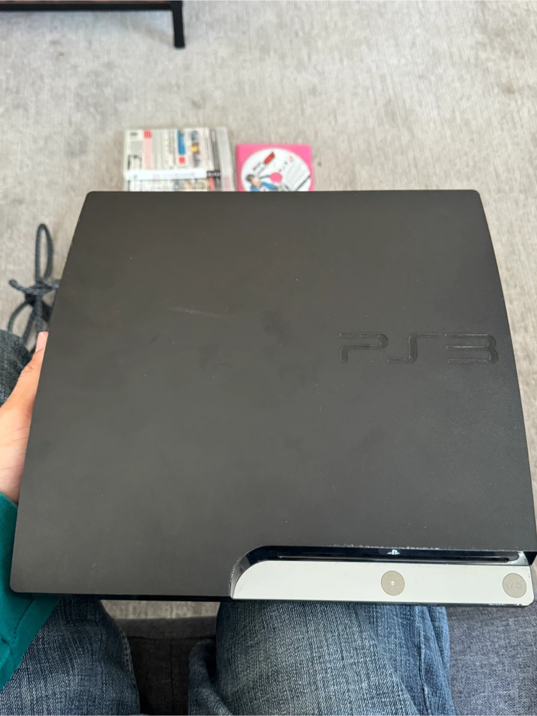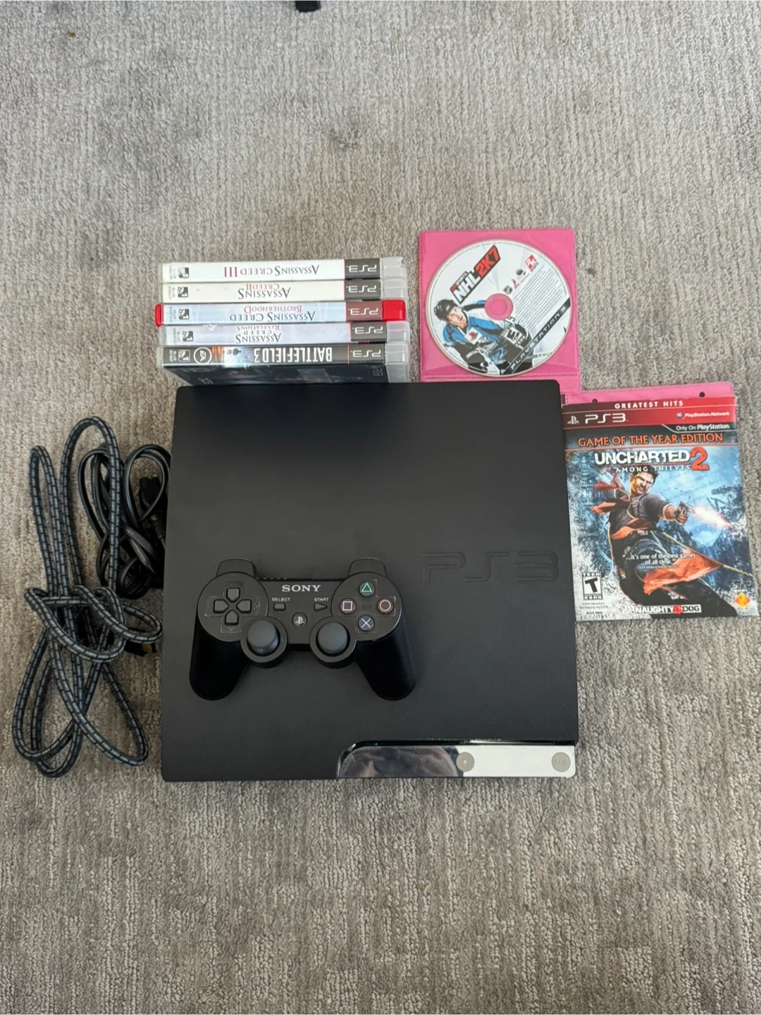 Selling a used PlayStation 3 (PS3) console. It comes with a controller and several games, including Assassin's Creed and Battlefield. Great for some retro gaming!