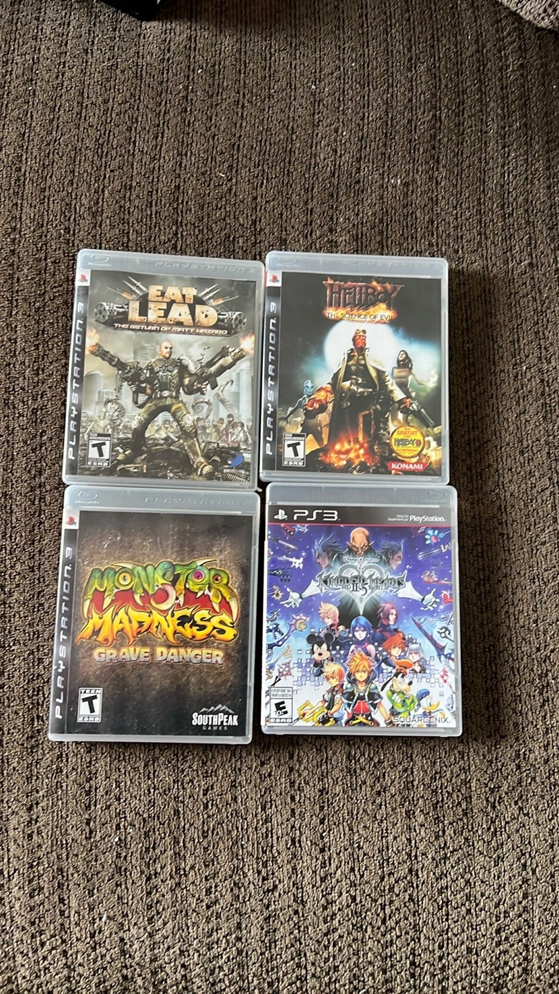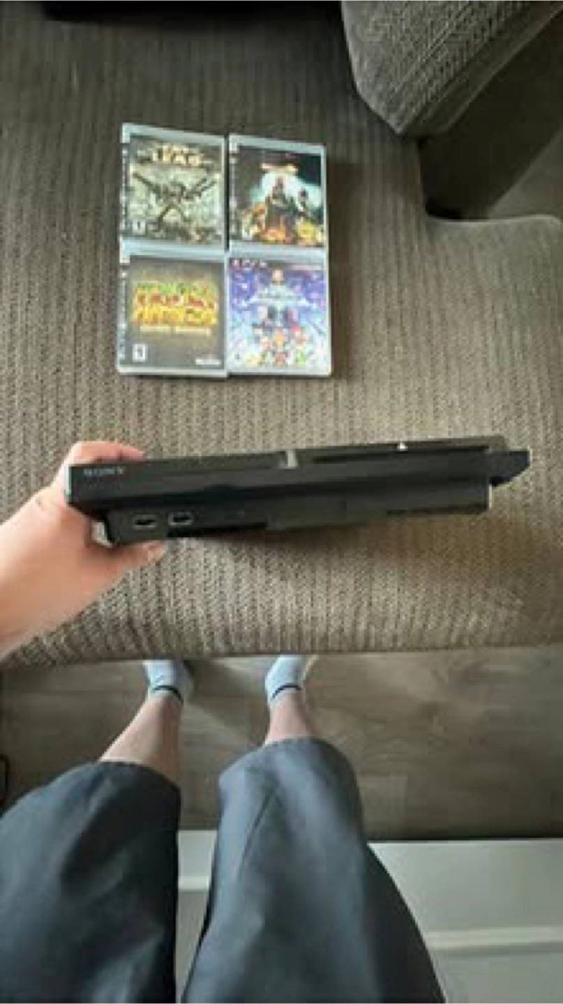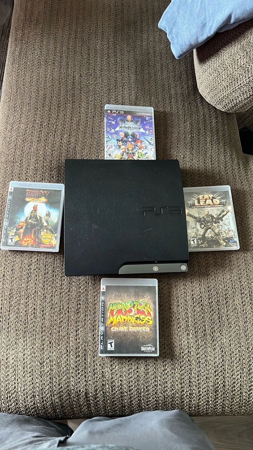 Selling a Playstation 3 console with two controllers and four games. Everything is in good working condition and ready for a new home! The games included are Eat Lead, Infernal, Monster Madness Grave Danger, and Kingdom Hearts.