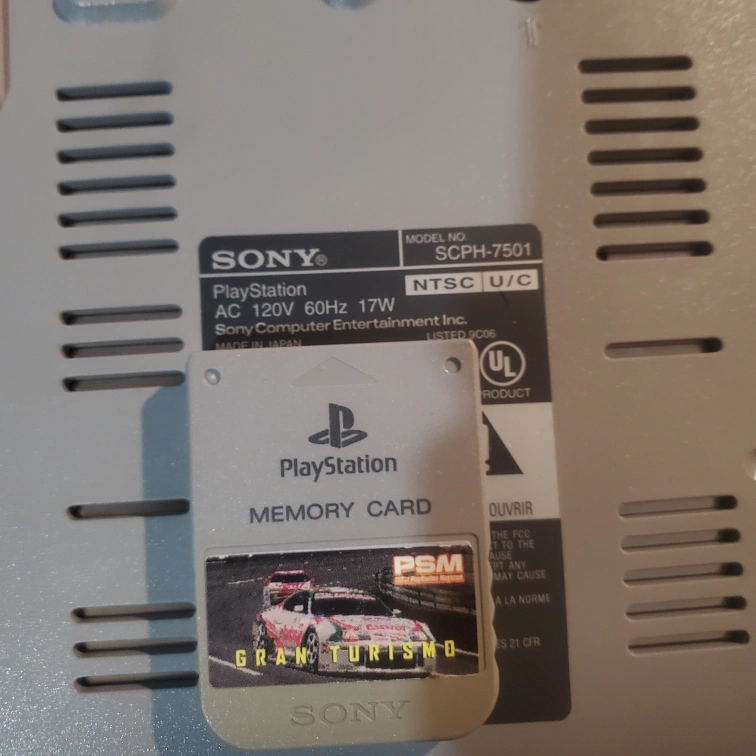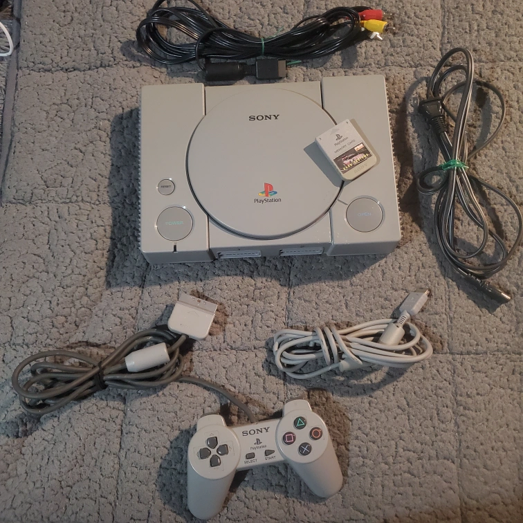 Selling a classic Sony PlayStation console, model SCPH-7501. It comes with all the necessary cables, one controller, and a free GT memory card. Original/Launch price: $299
