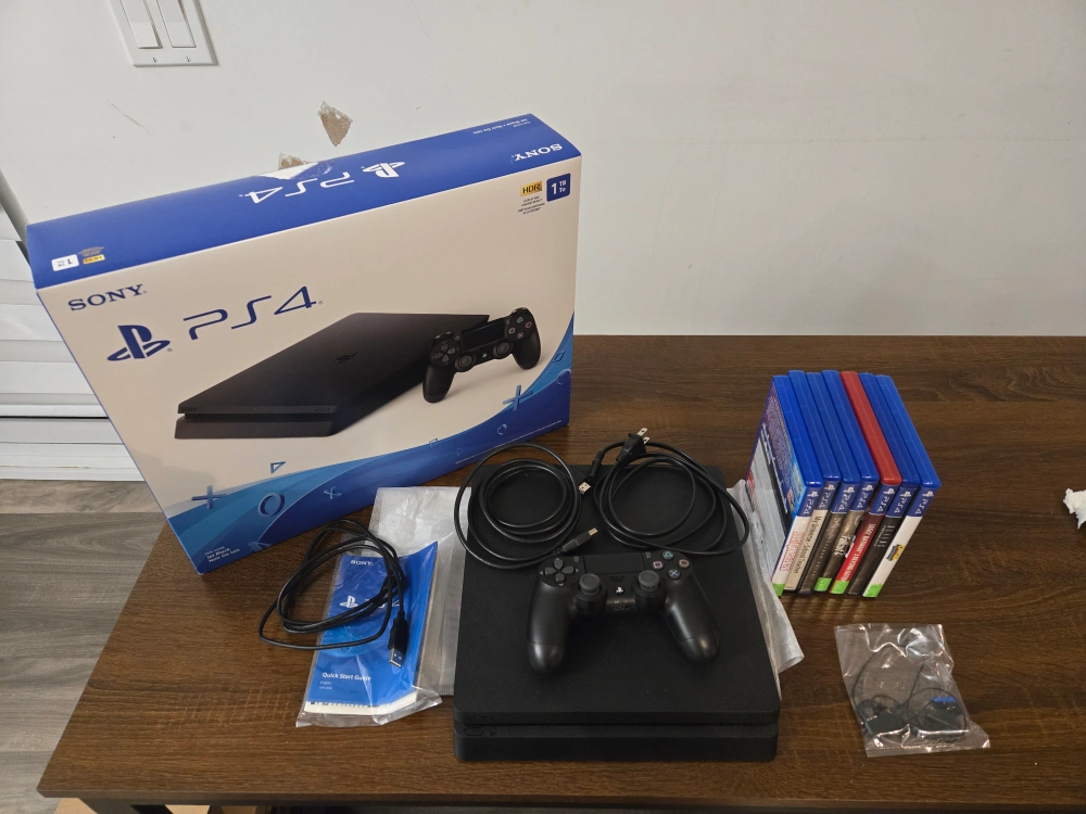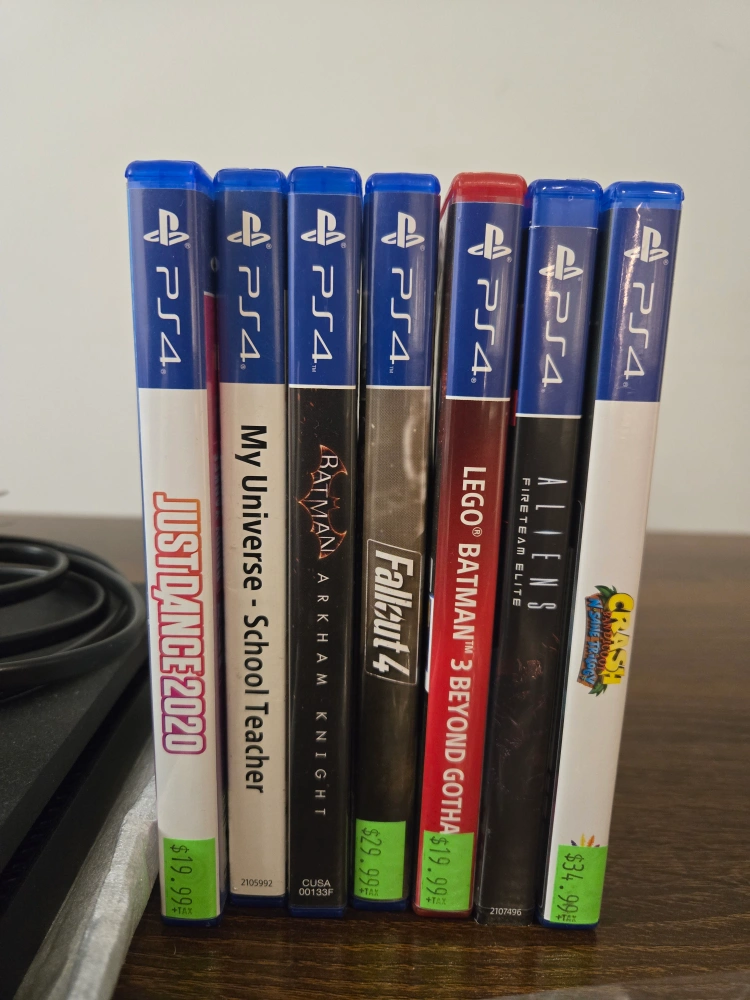 Selling a used PS4 console in good condition, comes with the box and all the components shown in the picture, including a controller, cables, and quick start guide. Also included are the following games: - Just Dance 2020 - My Universe - School Teacher - Batman Arkham Knight - Fallout 4 - Lego Batman 3 Beyond Gotham - Aliens Fireteam Elite - Crash Bandicoot - Triology