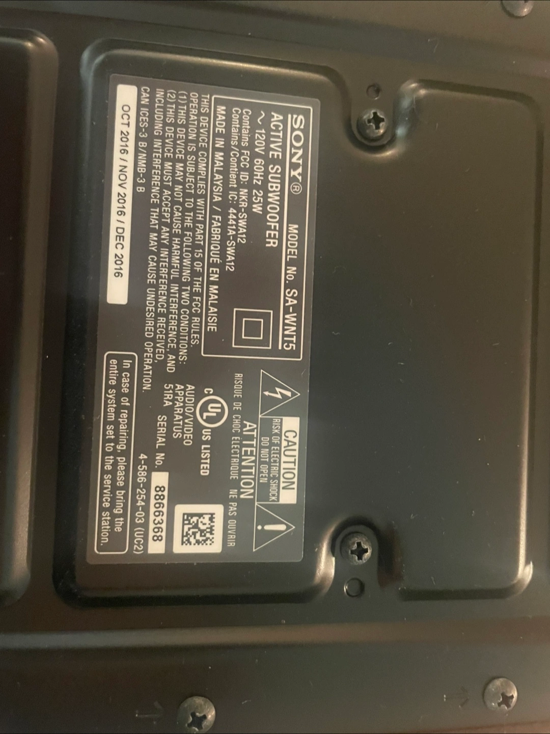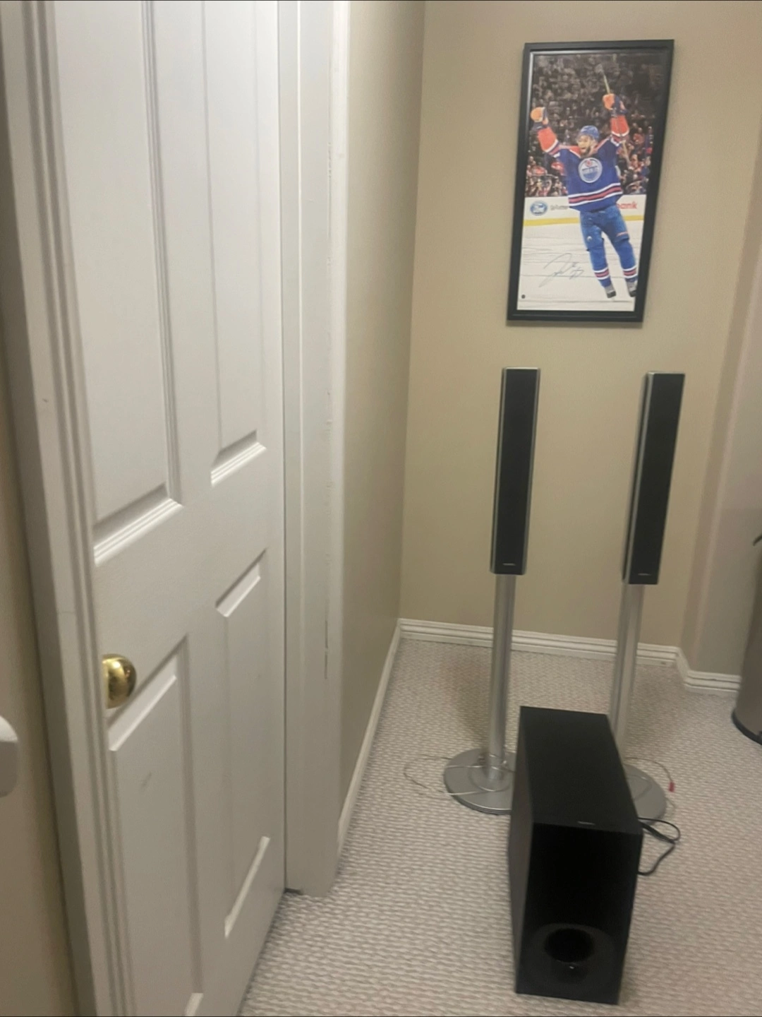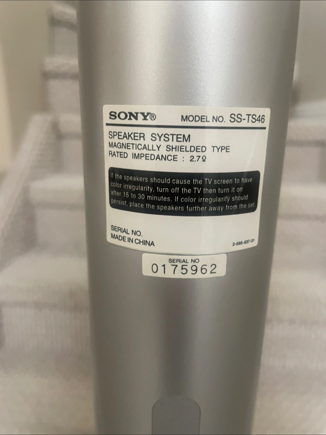 Selling a Sony speaker system, model SS-TS46. It's a magnetically shielded type with a rated impedance of 2.7Ω. Includes an active subwoofer, model SA-WM5. Great for your home theatre setup