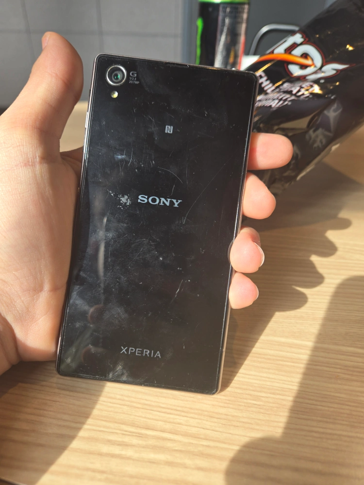 Used Sony Xperia smartphone. Black. Shows some wear. Unlockable.