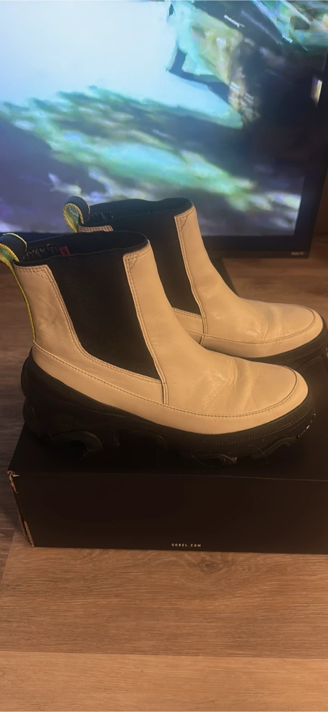 Selling a pair of Sorel Chelsea boots in size 8.5. They feature a stylish design with black and white colour blocking. The soles are durable and ready for Canadian weather! Send your offer!! Pick up: 88 Erskine ave.