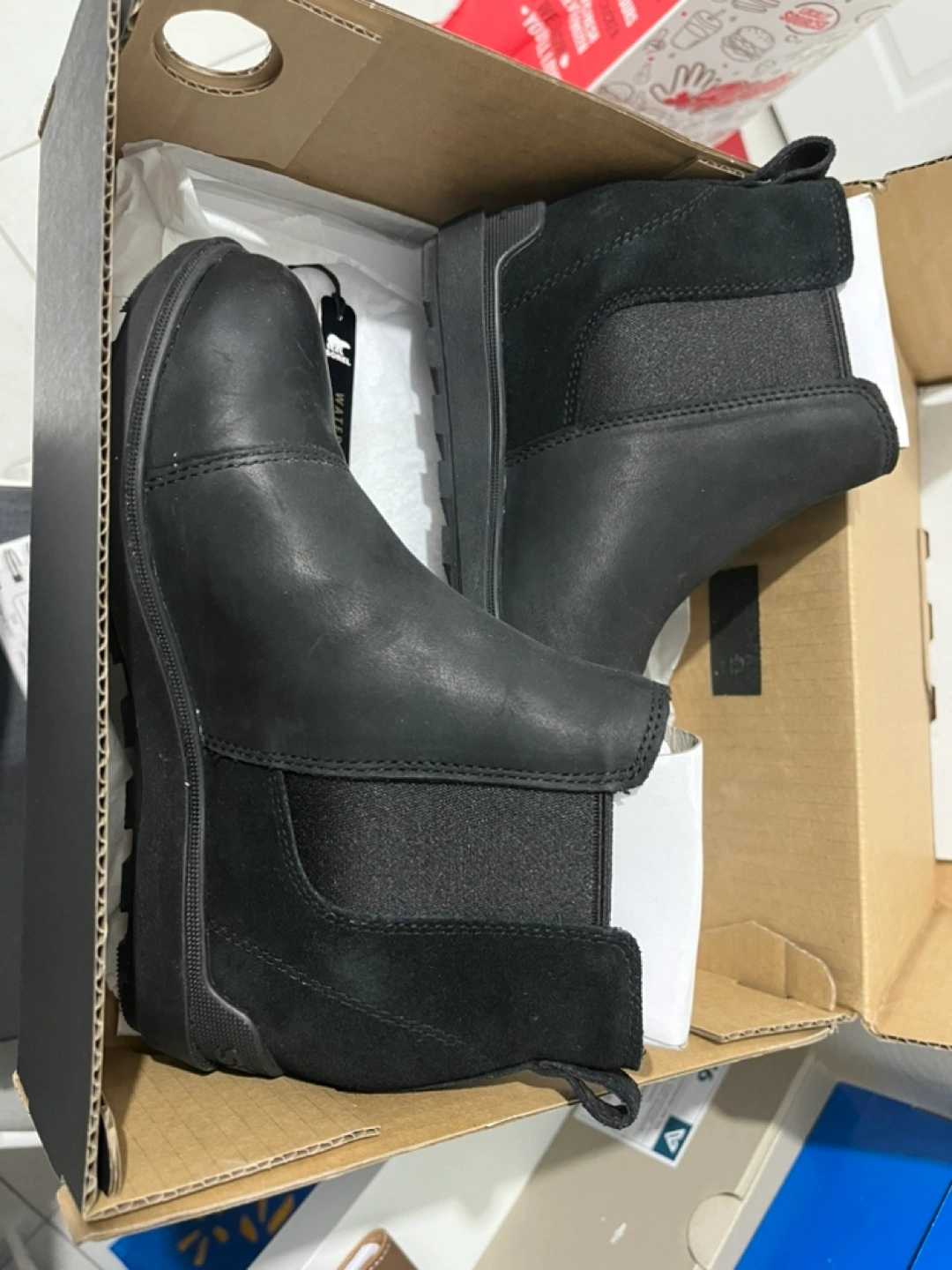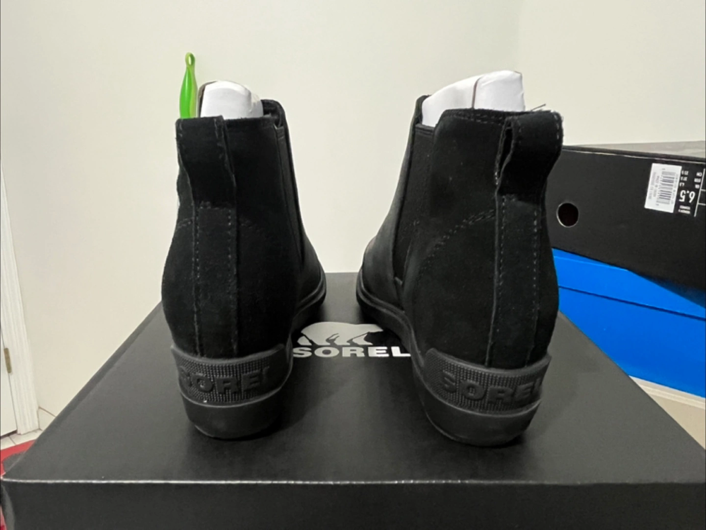 Pair of black suede ankle boots with box. The boots have elastic side panels and a heel. They come with the original box. These boots would be perfect for a walk in the park on a crisp fall day. Bought for $180+ tax inc. Used only thrice (size too small for me) Pickup around Killarney