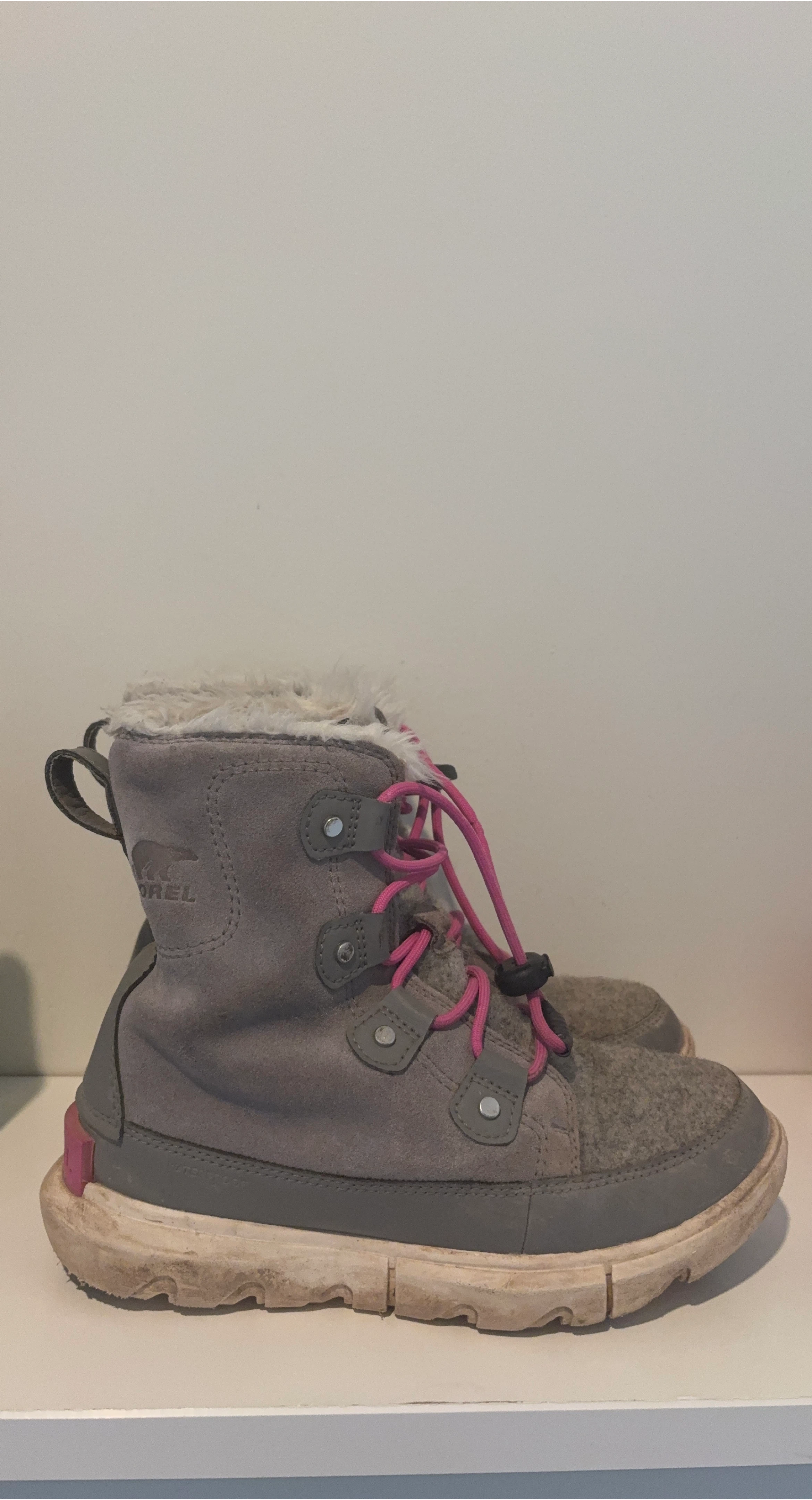 Selling a pair of Sorel Kids' Snow Commander winter boots in size 3 (US). They're grey with pink accents and have a cozy faux fur lining. Perfect for keeping little feet warm and dry during Canadian winters!