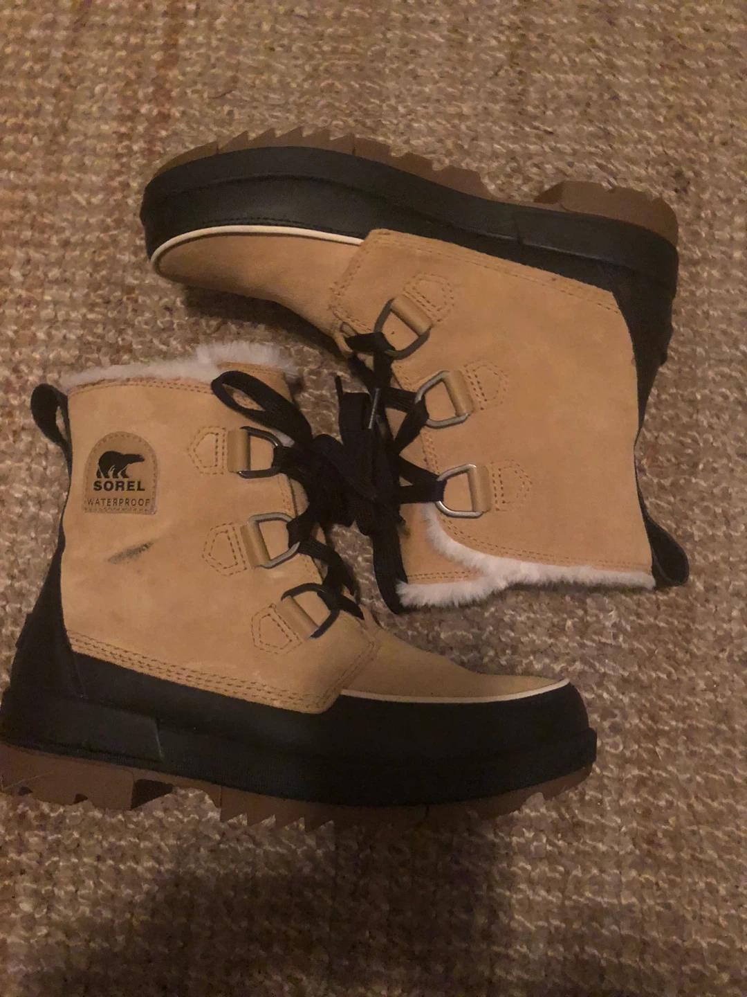 Selling a pair of Sorel winter boots! They're waterproof and ready for the snow. The boots are a tan colour with black accents and have a cozy, furry lining. Great for keeping your feet warm and dry during the winter months