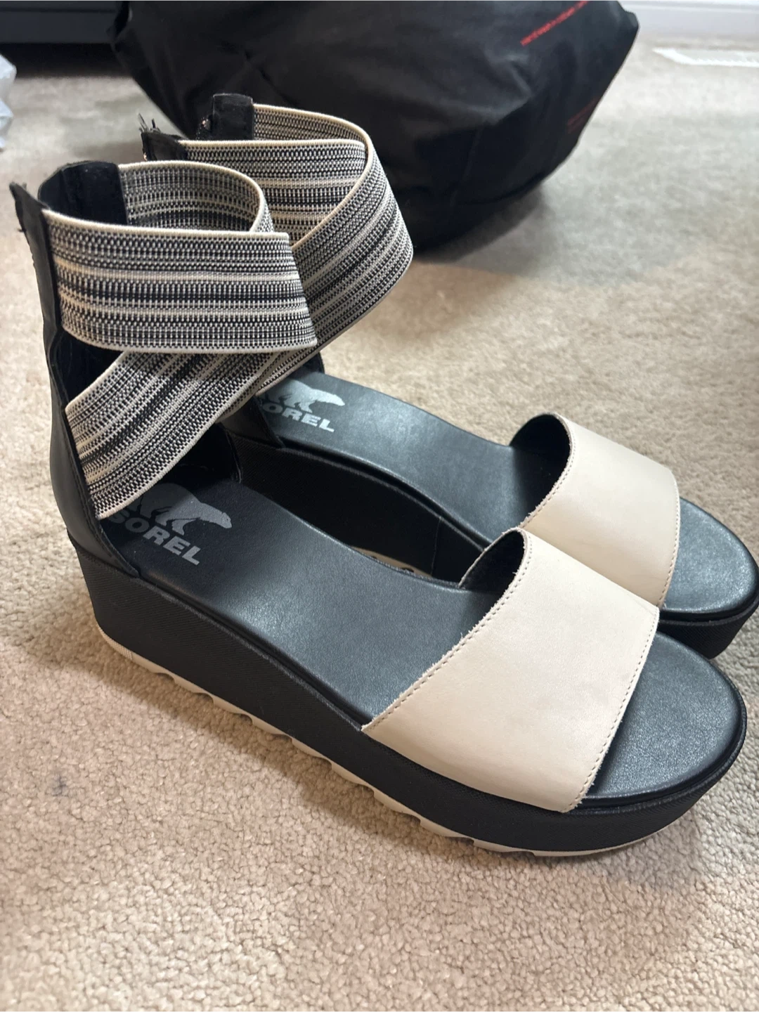 These Sorel Cameron Wedge Sandals are in great condition and ready for a new home! They feature a stylish black and cream colour scheme with a comfortable wedge heel. The size is US 8. Perfect for adding a bit of height and style to your summer outfits!