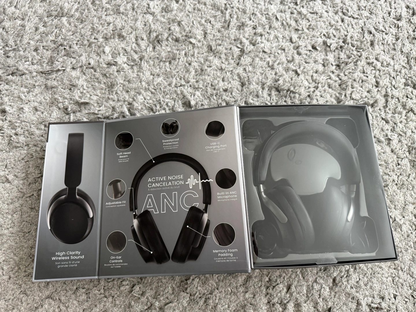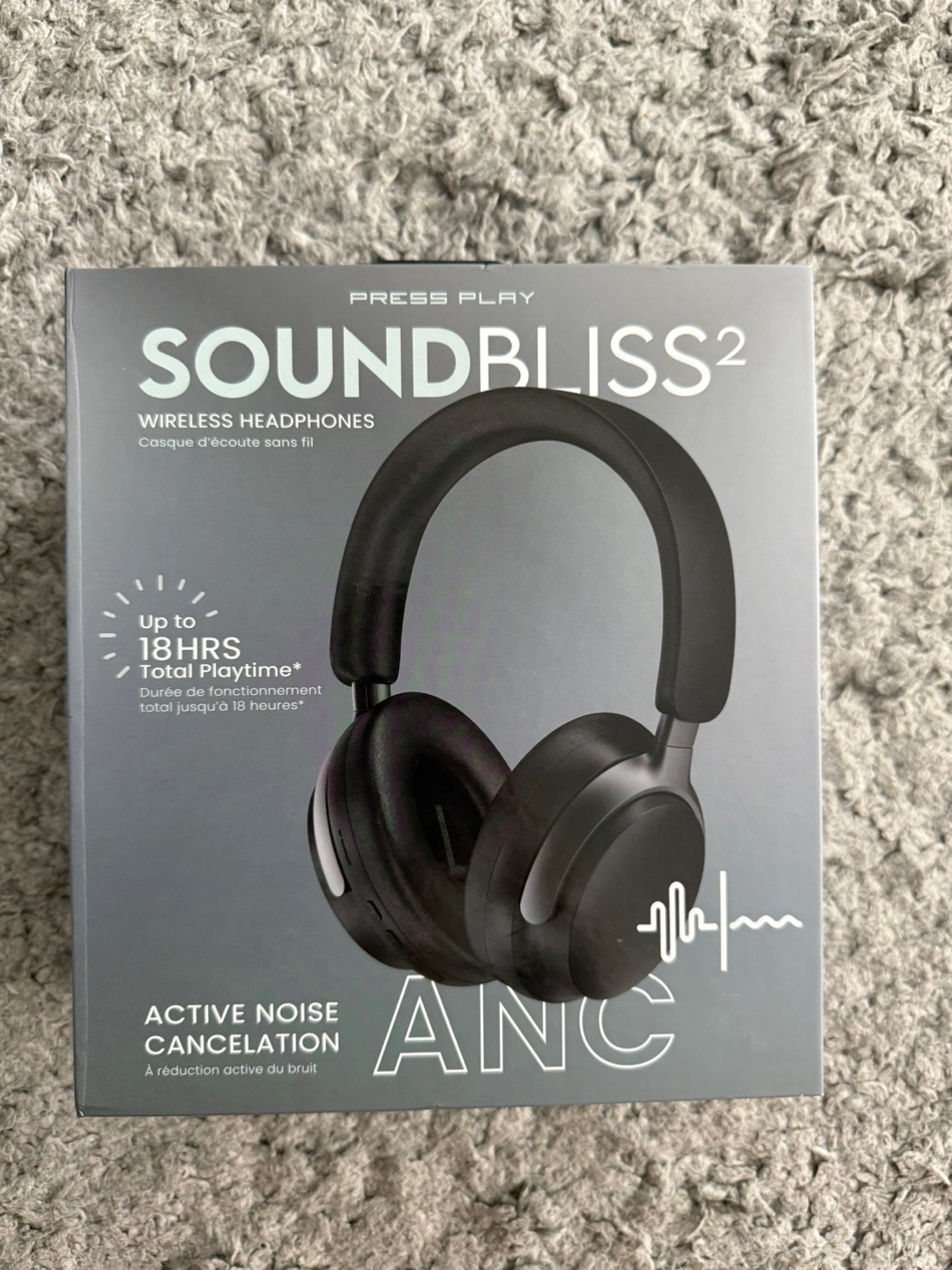 Selling a brand new pair of Soundbliss2 wireless headphones! They're still in the original packaging and haven't been used. These headphones feature: - Up to 18 hours of total playtime - Active Noise Cancellation (ANC) - High clarity wireless sound - On-ear controls - Sweatproof protection - USB-C charging port - Built-in ANC microphone - Memory foam padding