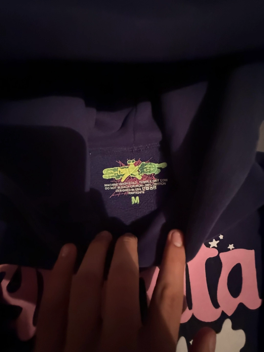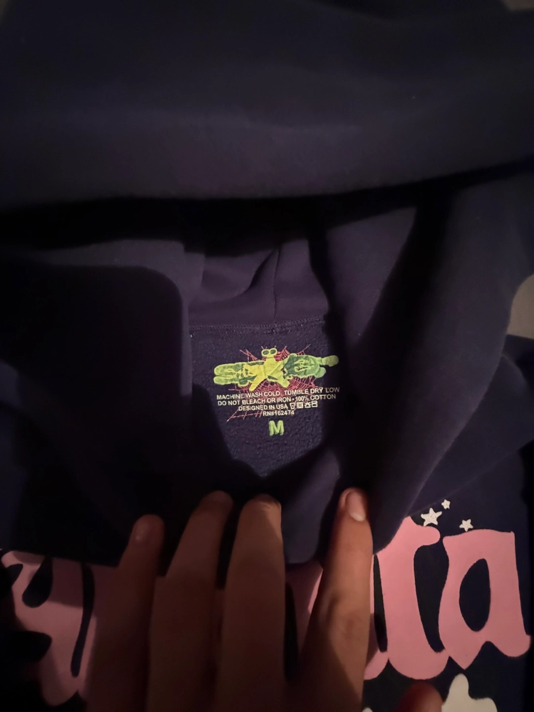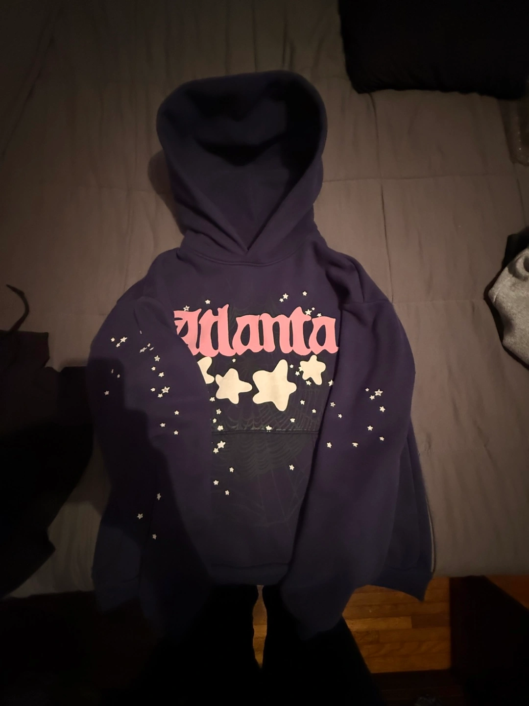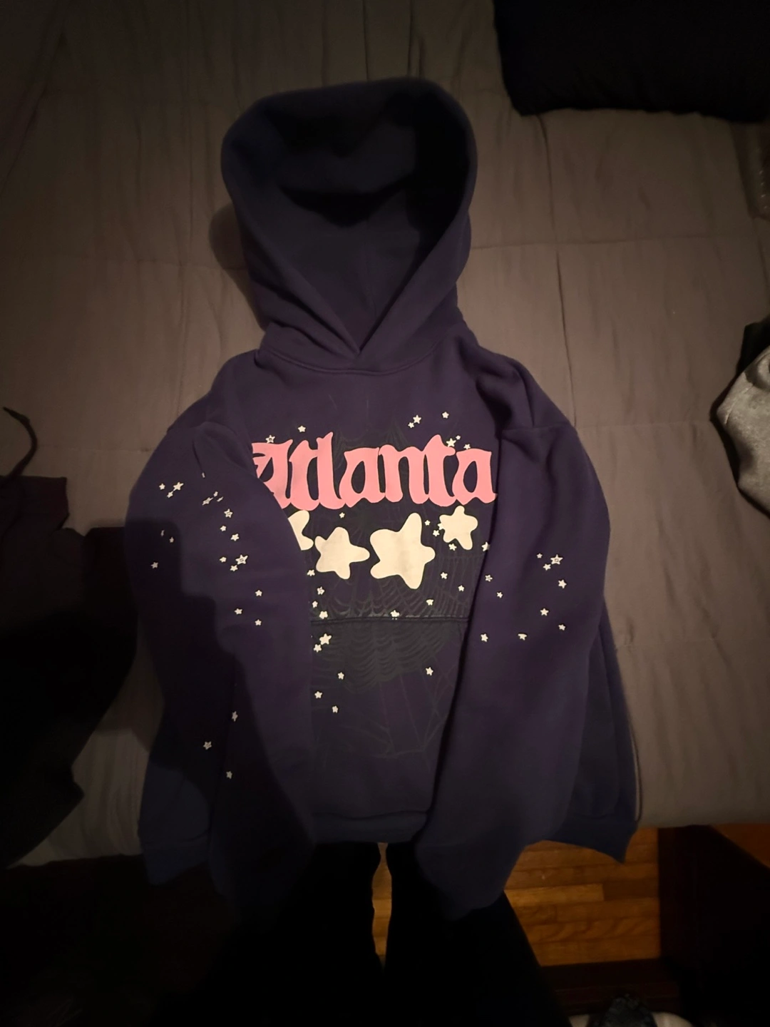 Selling a Sp5der Atlanta hoodie in size medium! It's in great condition and features a unique design with the Atlanta logo and star details. The material is comfortable and perfect for everyday wear.