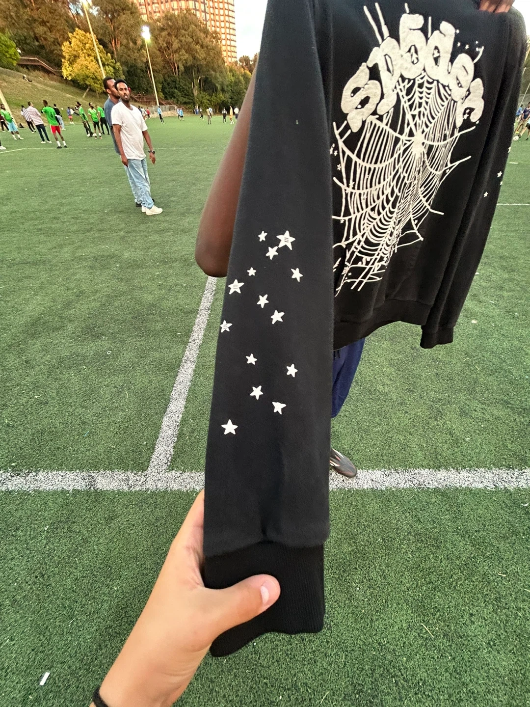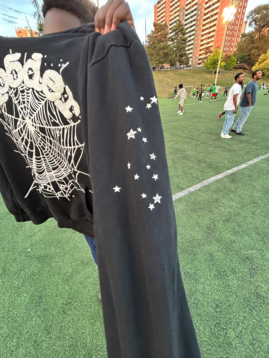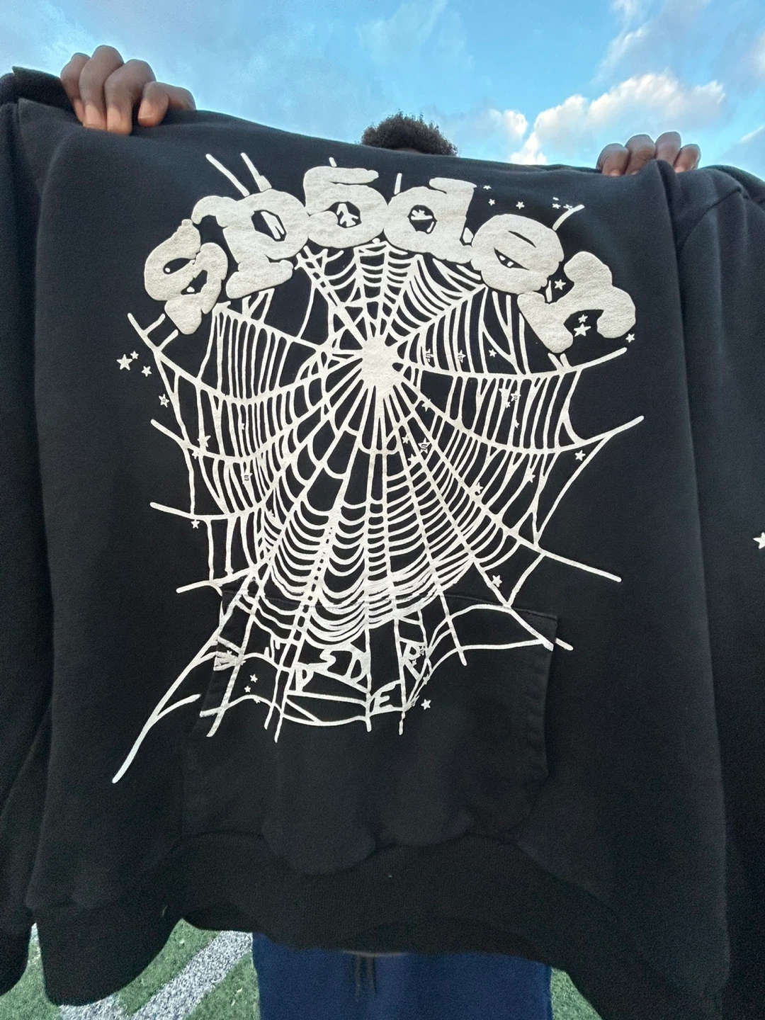 Selling a Sp5der hoodie in black, size XL! The hoodie features a spiderweb design on the back and stars on the sleeves. It's in great condition!
