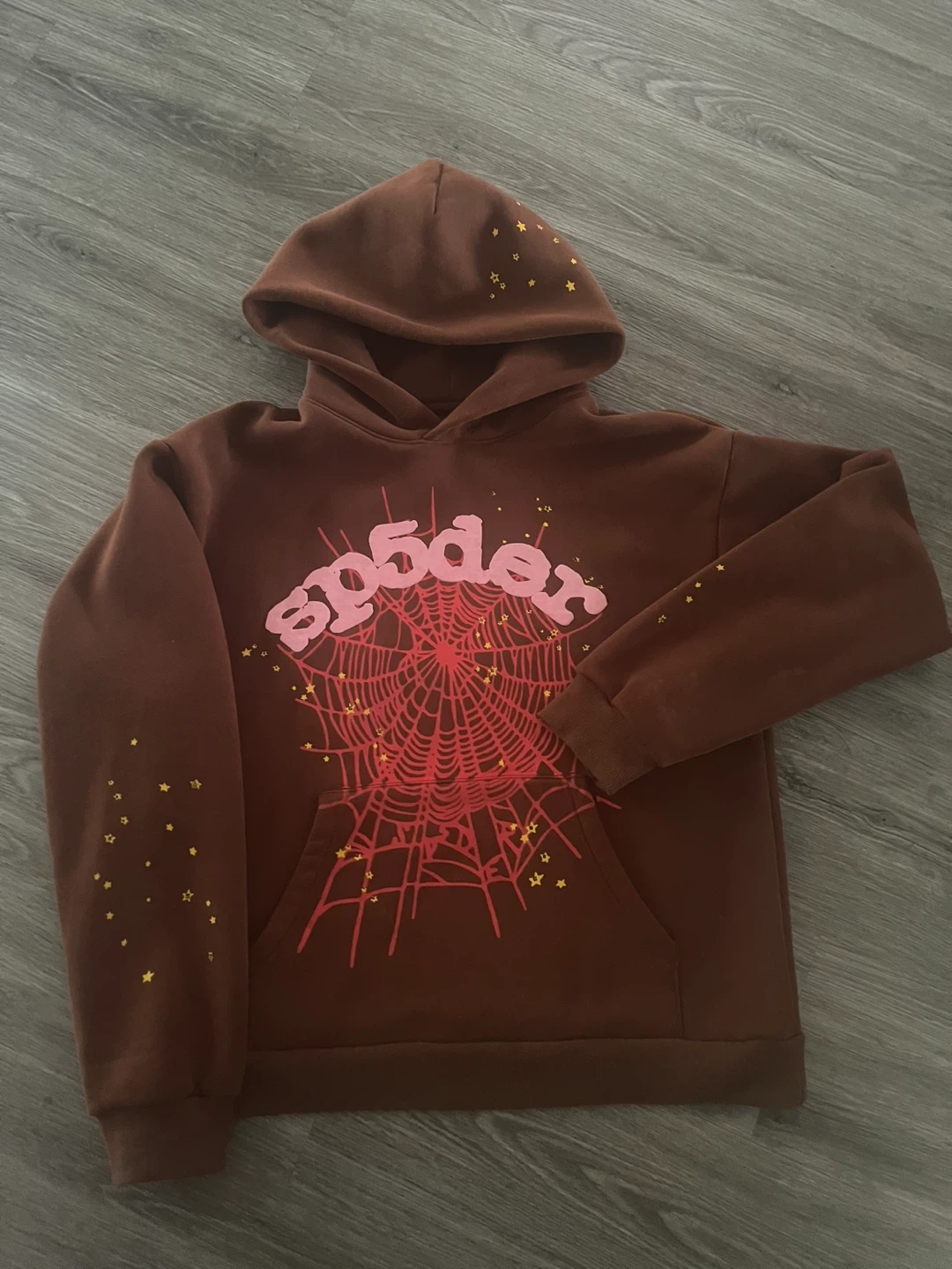 Selling a Sp5der hoodie in brown, size medium. It features a unique spiderweb design with star accents. The material is 100% cotton, so it's nice and comfy. Just machine wash cold and tumble dry low to keep it looking its best!