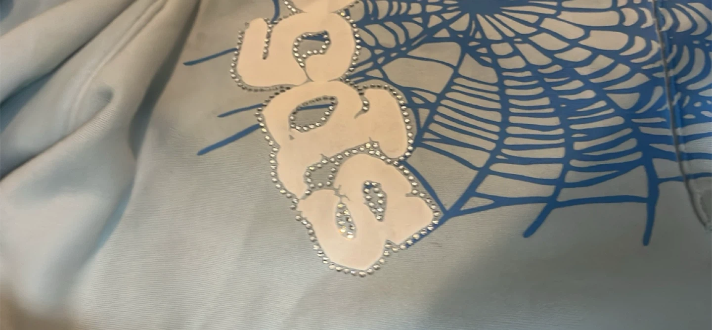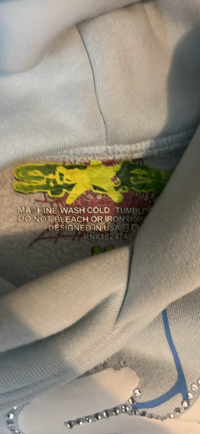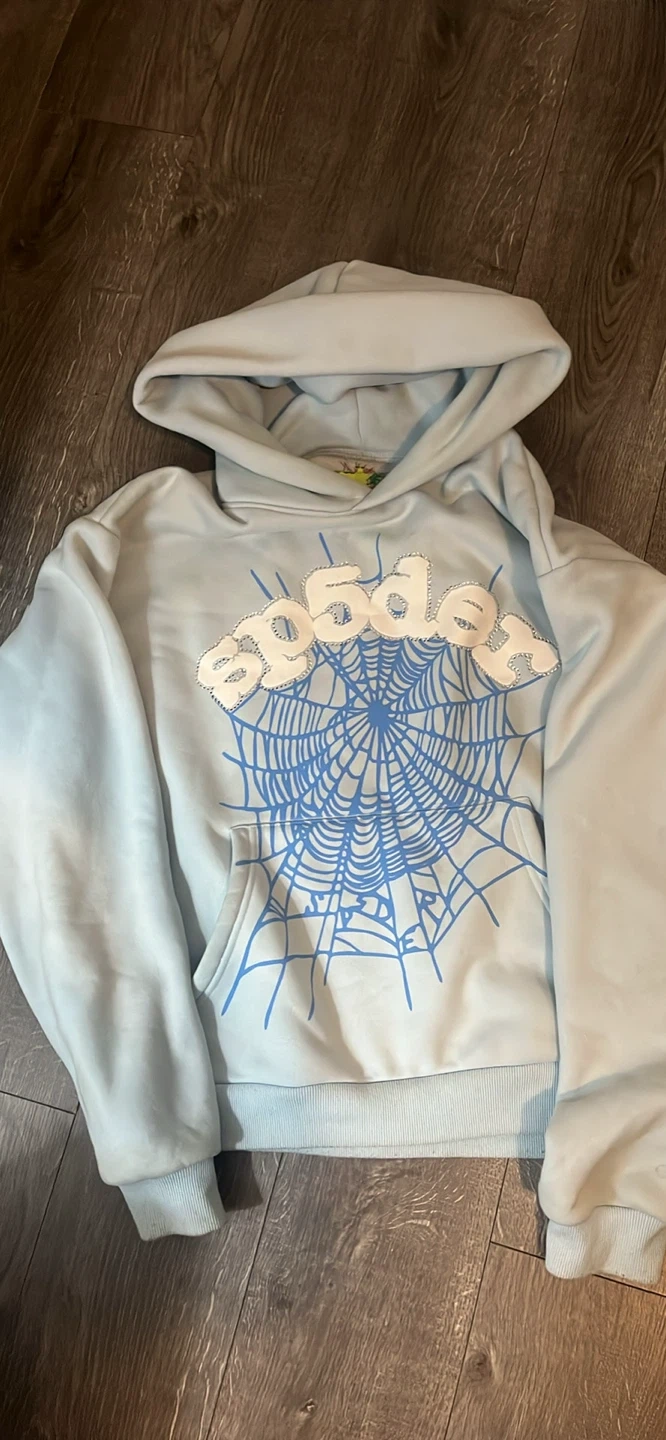 Selling a Sp5der hoodie in size medium! It's a light blue colour with a spiderweb design. The material is 100% cotton and it's designed in the USA