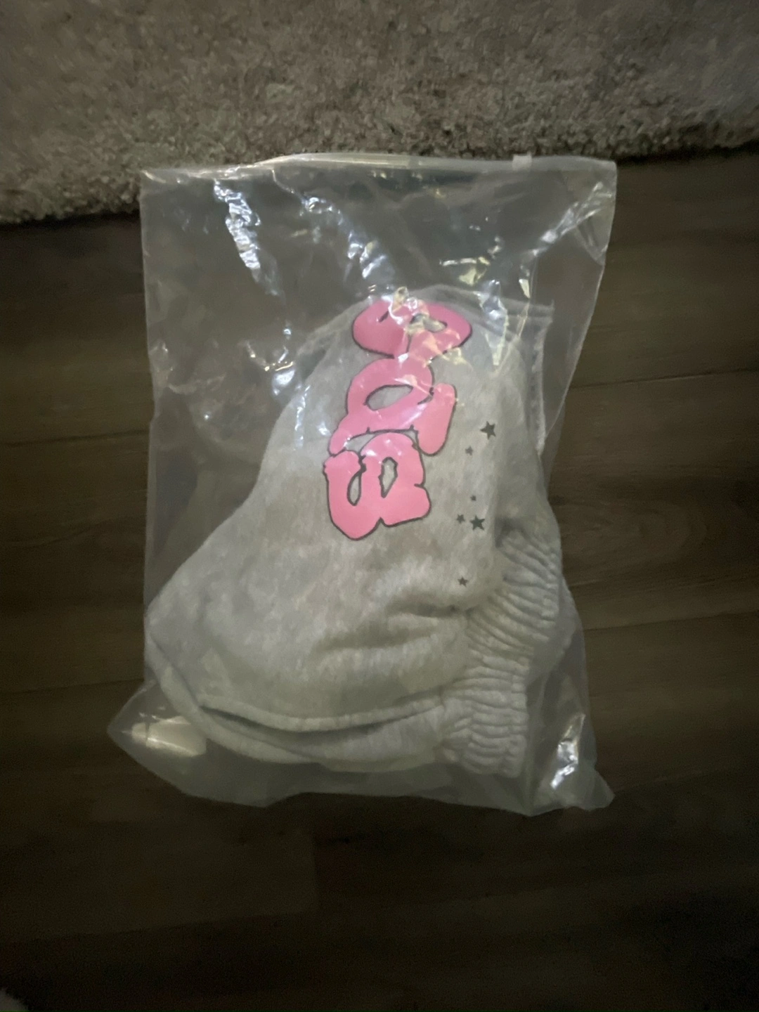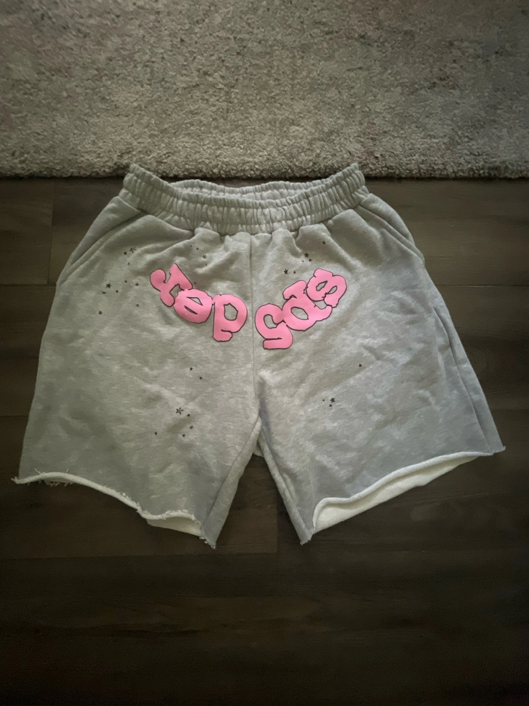 Selling a pair of grey sp5der shorts. They feature a pink logo design and have a raw hem. Great for casual wear! Comes with bags and tags