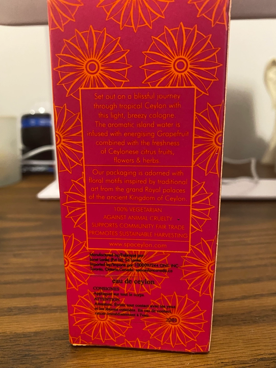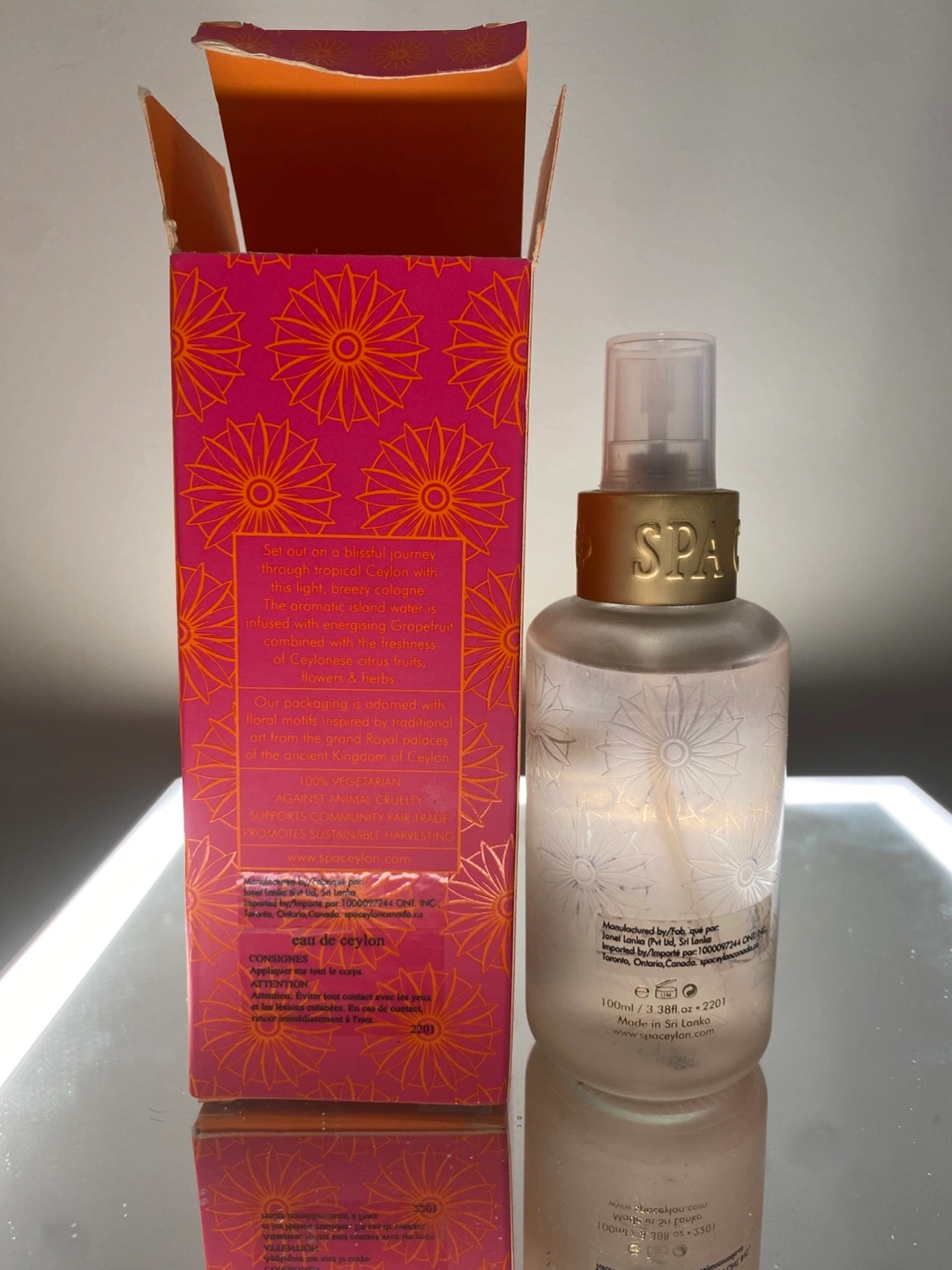 Product Description (from box): “Set out on a blissful journey through tropical Ceylon with this light, breezy cologne. The aromatic island water is infused with energising Grapefruit combined with the freshness of Ceylonese citrus fruits, flowers & herbs. Our packaging is adorned with floral motits inspired by traditional art trom the grand Royal palaces of the ancient Kingdom of Ceylon” 100% VEGETARIAN AGAINST ANIMAL CRUELTY - SUPPORTS COMMUNITY FAIR TRADE PROMOTES SUSTAINABLE HARVESTING Product of Sri Lanka