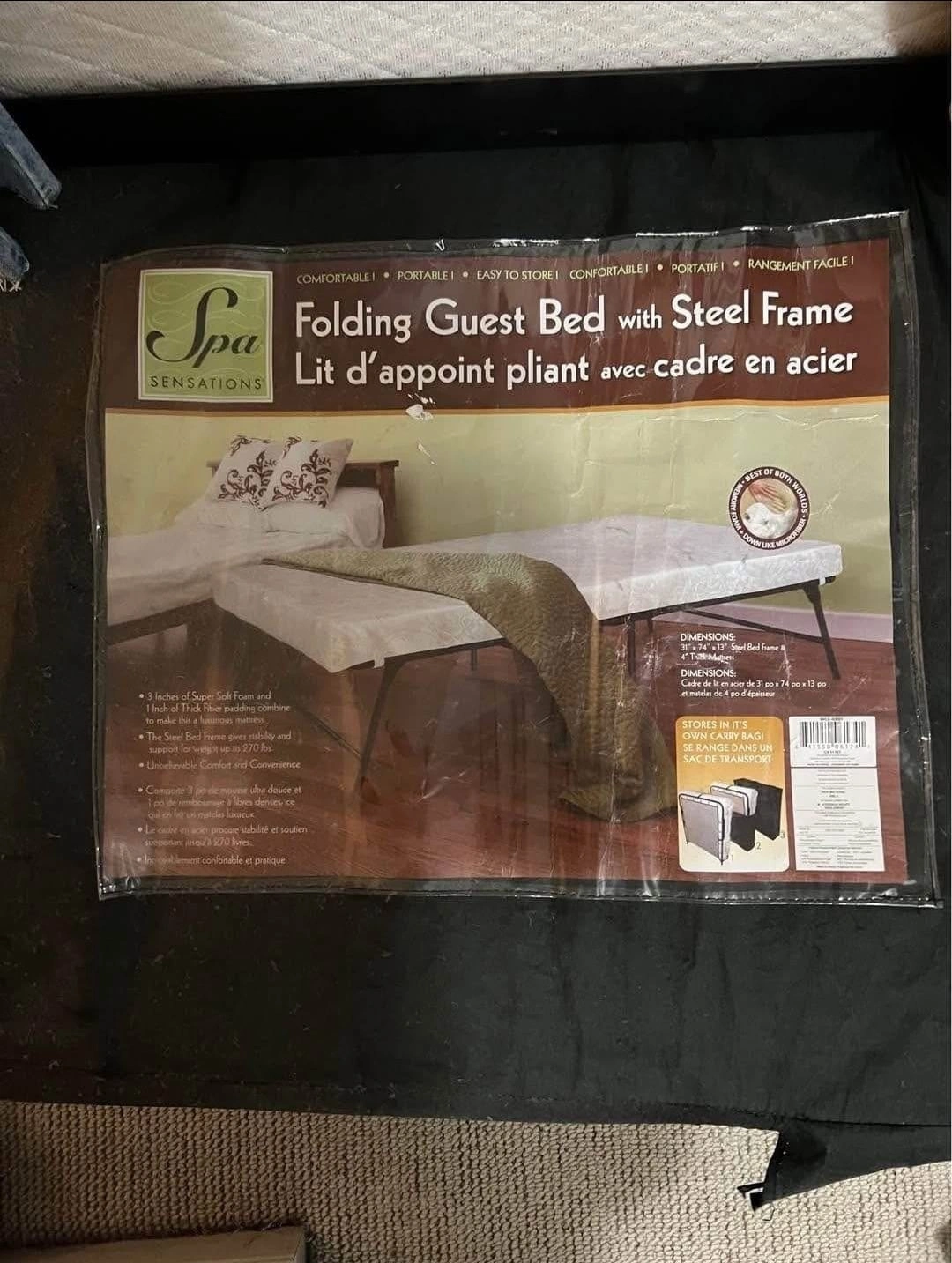 Selling a Spa Sensations folding guest bed with a steel frame. It's comfortable, portable, and easy to store. The mattress includes 3 inches of super soft foam and 1 inch of thick fiber padding. The steel bed frame provides stability and support for weights up to 270 lbs. It conveniently stores in its own carry bag. Dimensions are 31" x 74" x 13" for the steel bed frame and 4" for the mattress