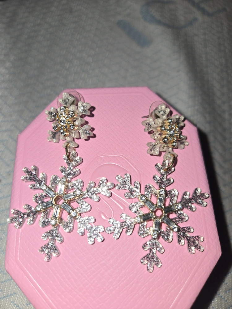 These earrings feature a snowflake design, perfect for a wintry look. They are adorned with what looks like crystals. A great accessory for making you feel elegant, like you're attending a fancy winter ball.