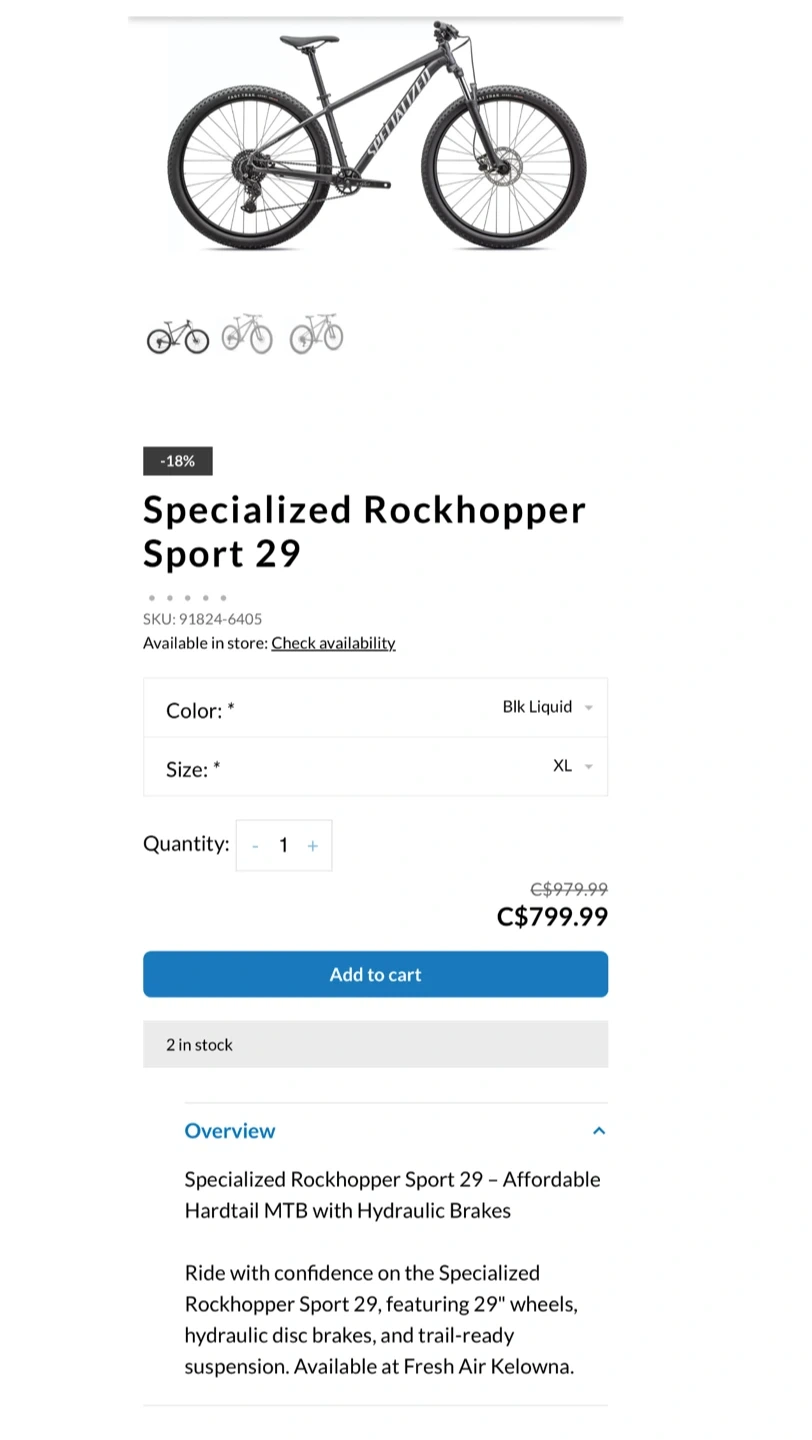 Selling a Specialized Rockhopper Sport 29. It's an affordable hardtail MTB with hydraulic brakes and trail-ready suspension. The frame size is XL. Ride with confidence on this bike featuring 29" wheels. Includes bell, front and rear lights, phone holder, side mirror, water bottle and bike cover.