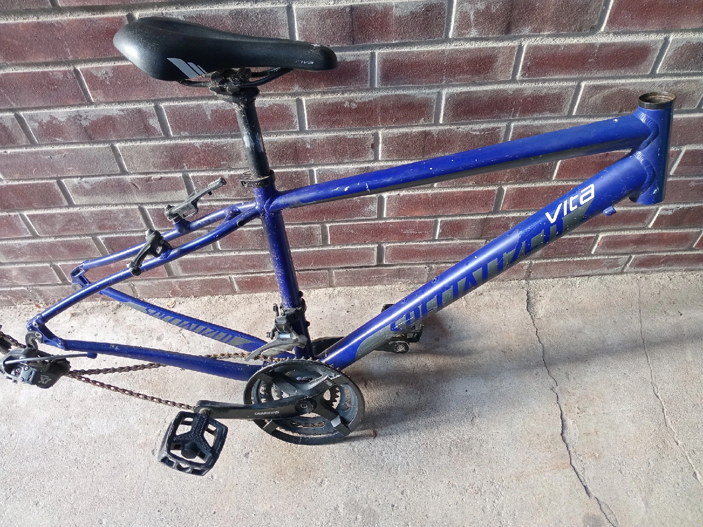 Selling a Specialized Vita bike frame. It's blue and has some wear and tear, as you can see in the photos. Comes with the seat, pedals, and chain. Perfect for a DIY project or replacing a damaged frame! Asking $65