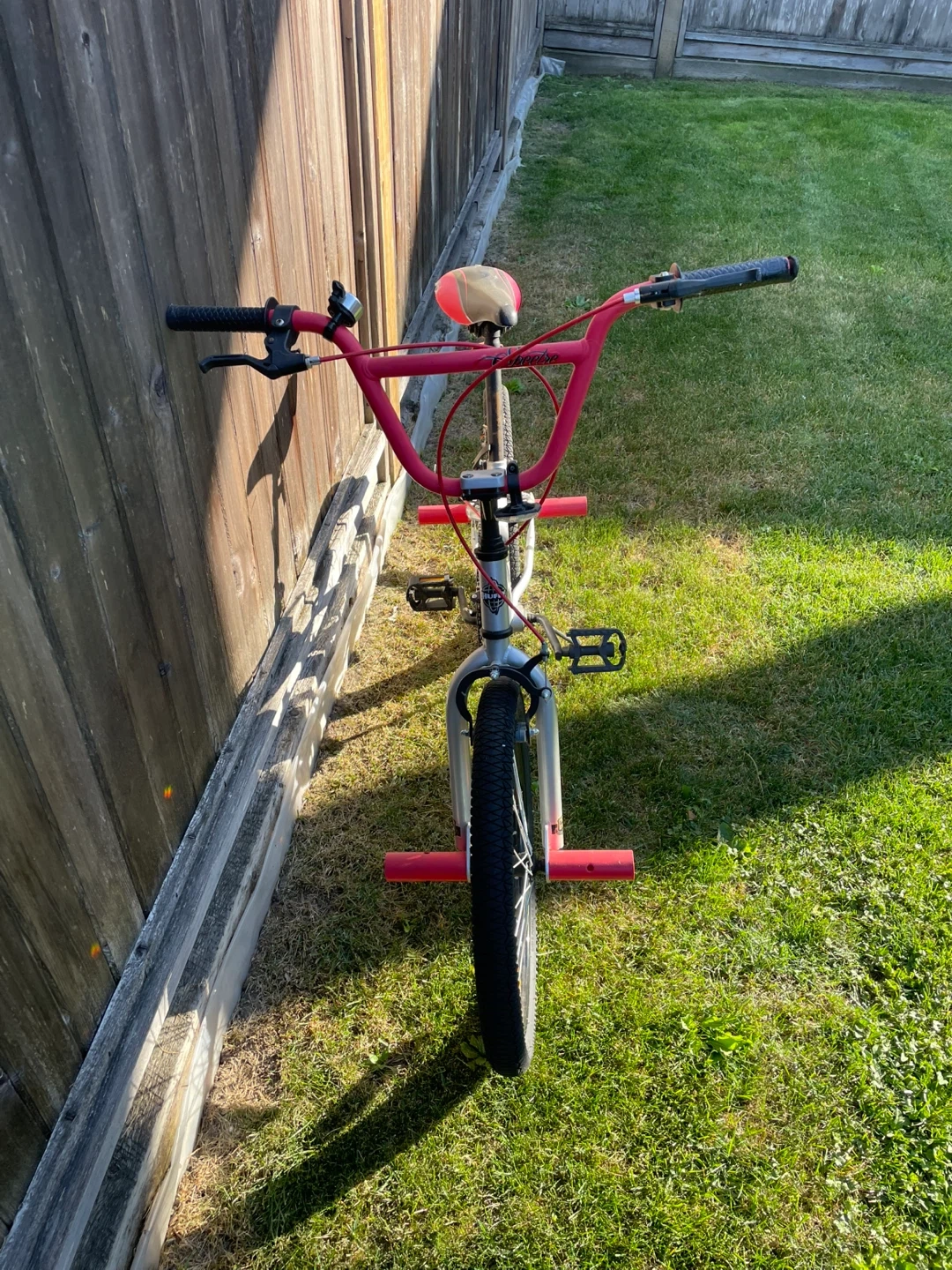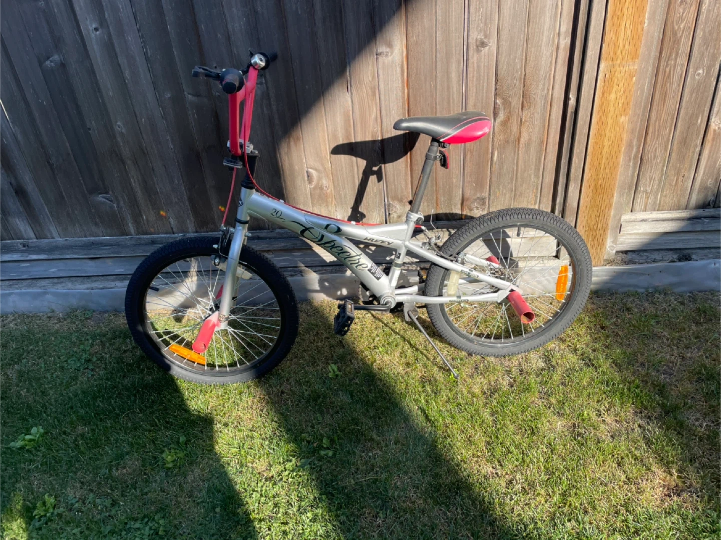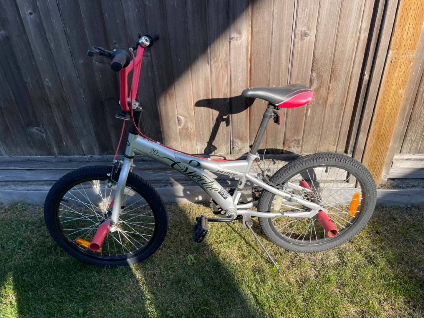 Selling a Spectre Drifter 20-inch BMX bike in silver and red. It's in good condition and ready for some fun rides!