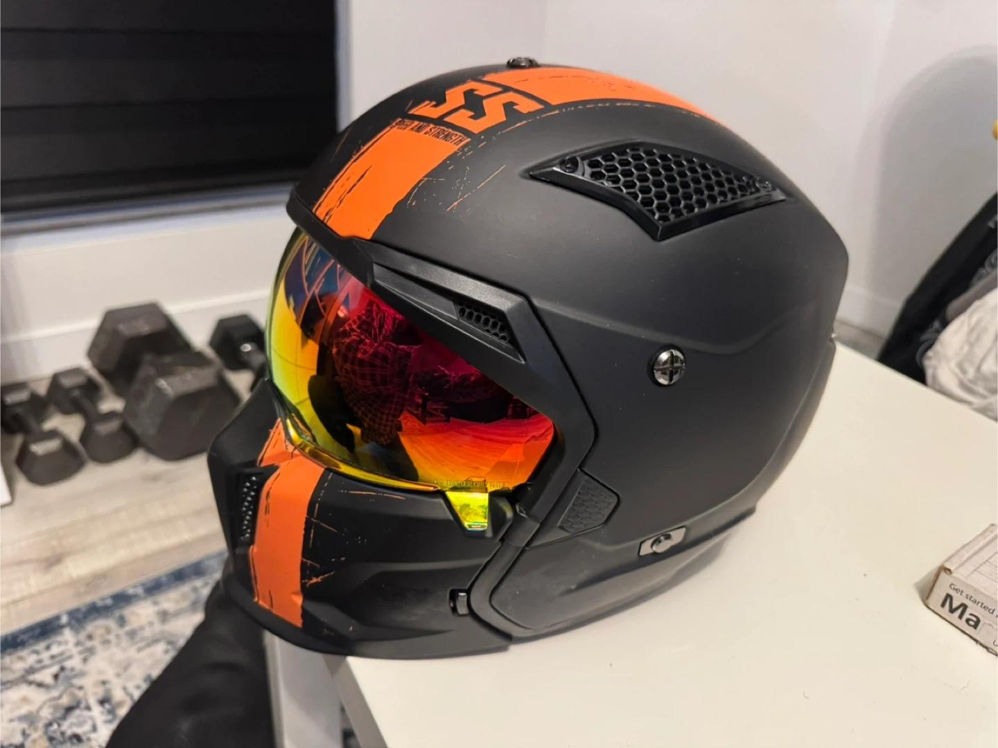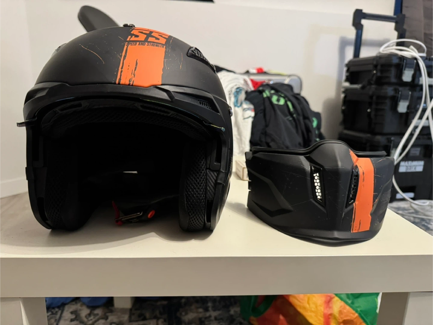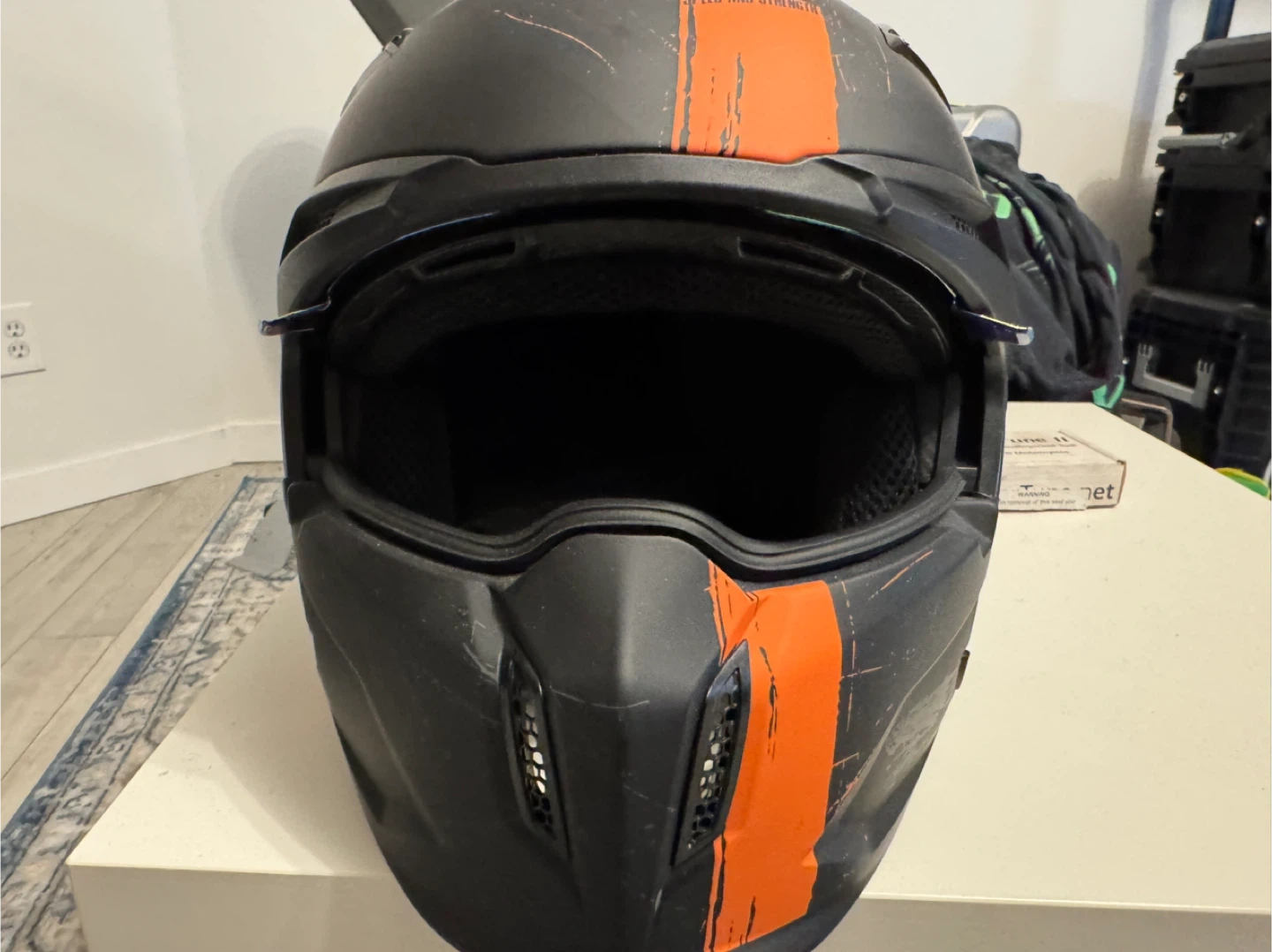 Selling a Speed and Strength (large) helmet in black with orange stripes. New condition never worn. Modular design, removable chin piece. Helmet includes a clear visor.