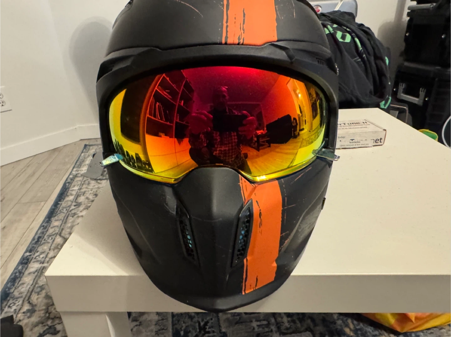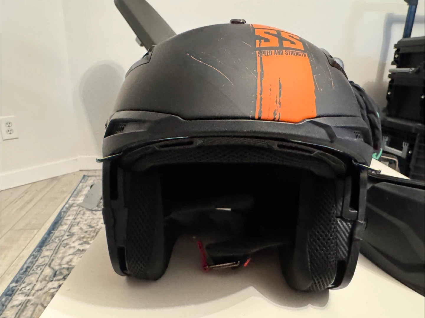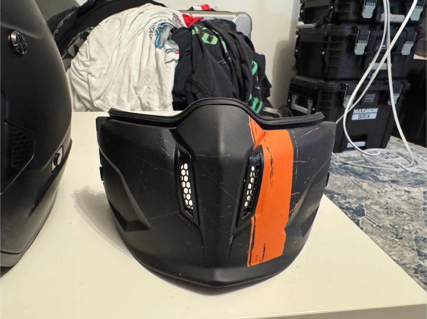 Selling a Speed and Strength (large) helmet in black with orange stripes. New condition never worn. Modular design, removable chin piece. Helmet includes a clear visor.