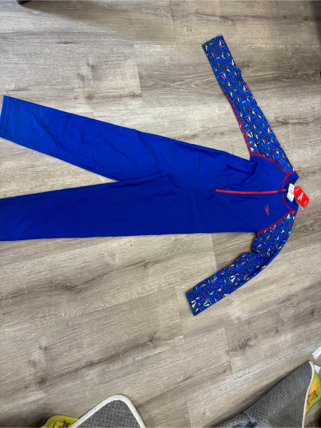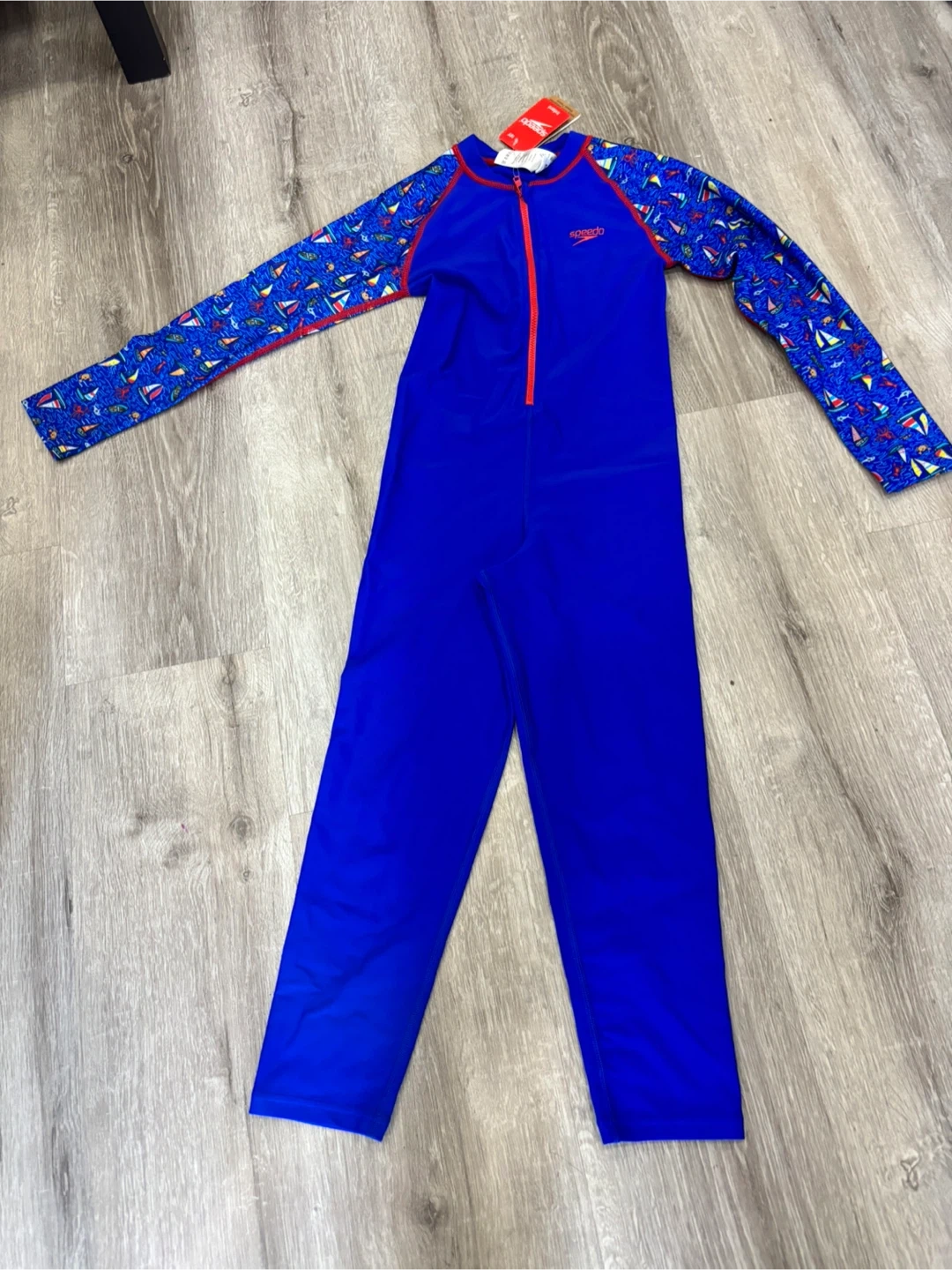 This Speedo swimsuit is brand new not used once and ready for the pool! It features long sleeves with a fun, colourful pattern and a full-length design. The main body is a solid blue, and it's a size 32. Perfect for swimming lessons or just having fun in the water