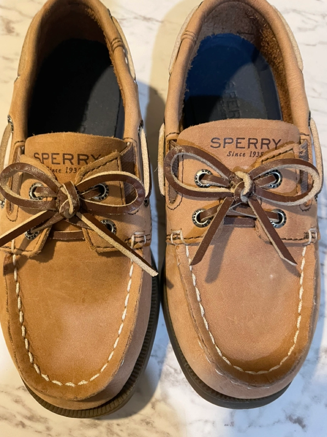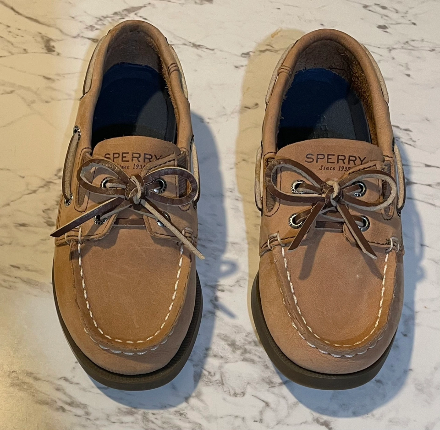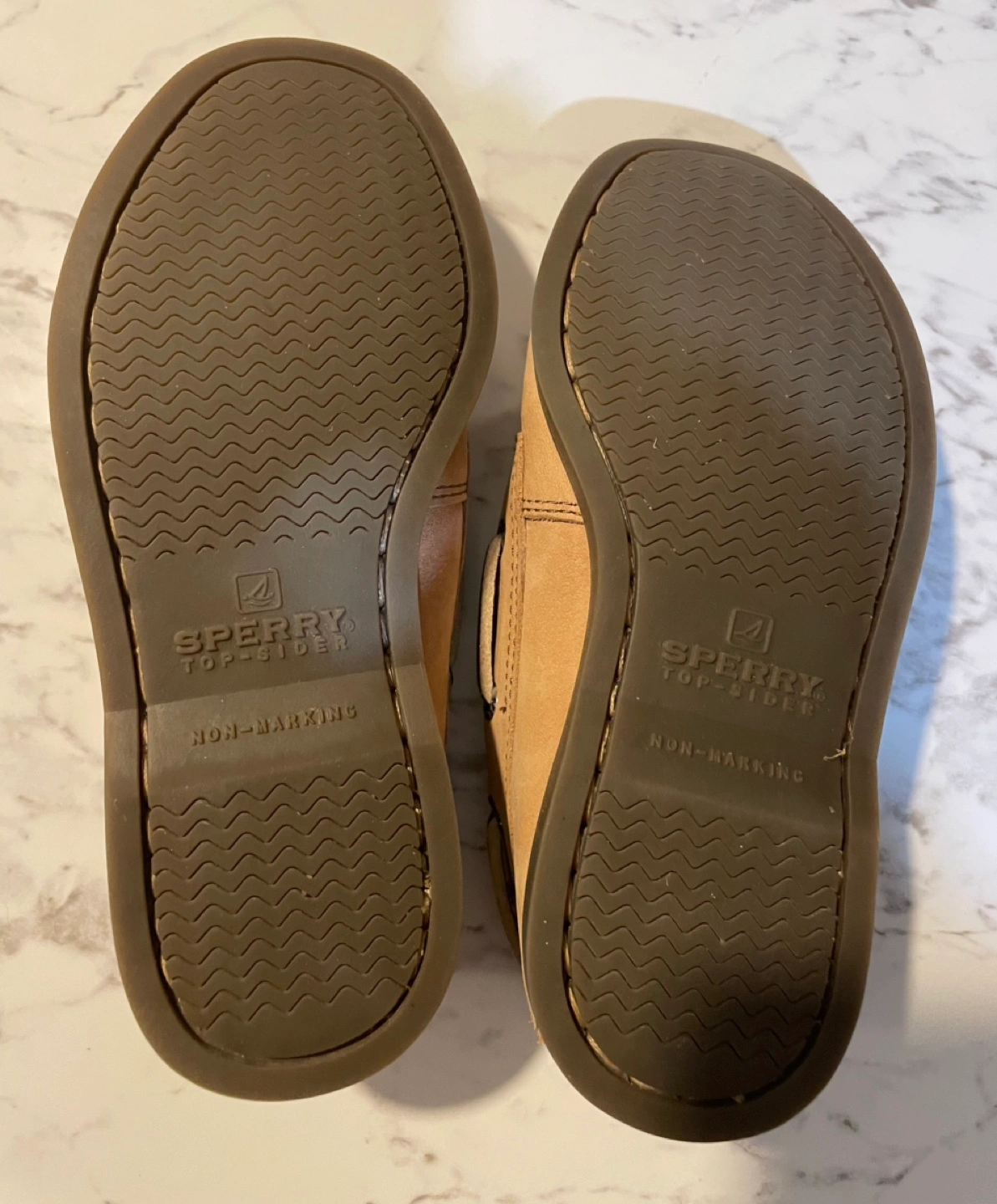 Tan leather boat shoes. Brown laces. Non-marking soles.