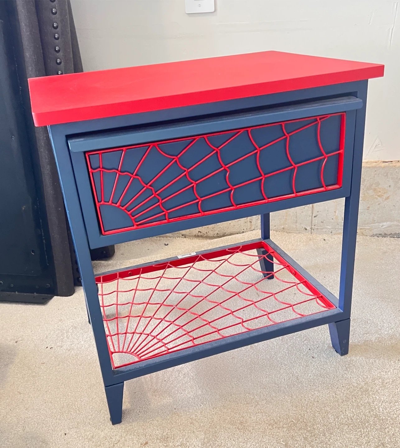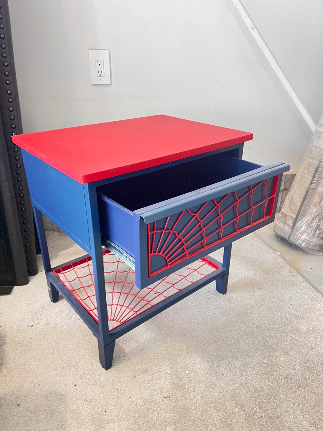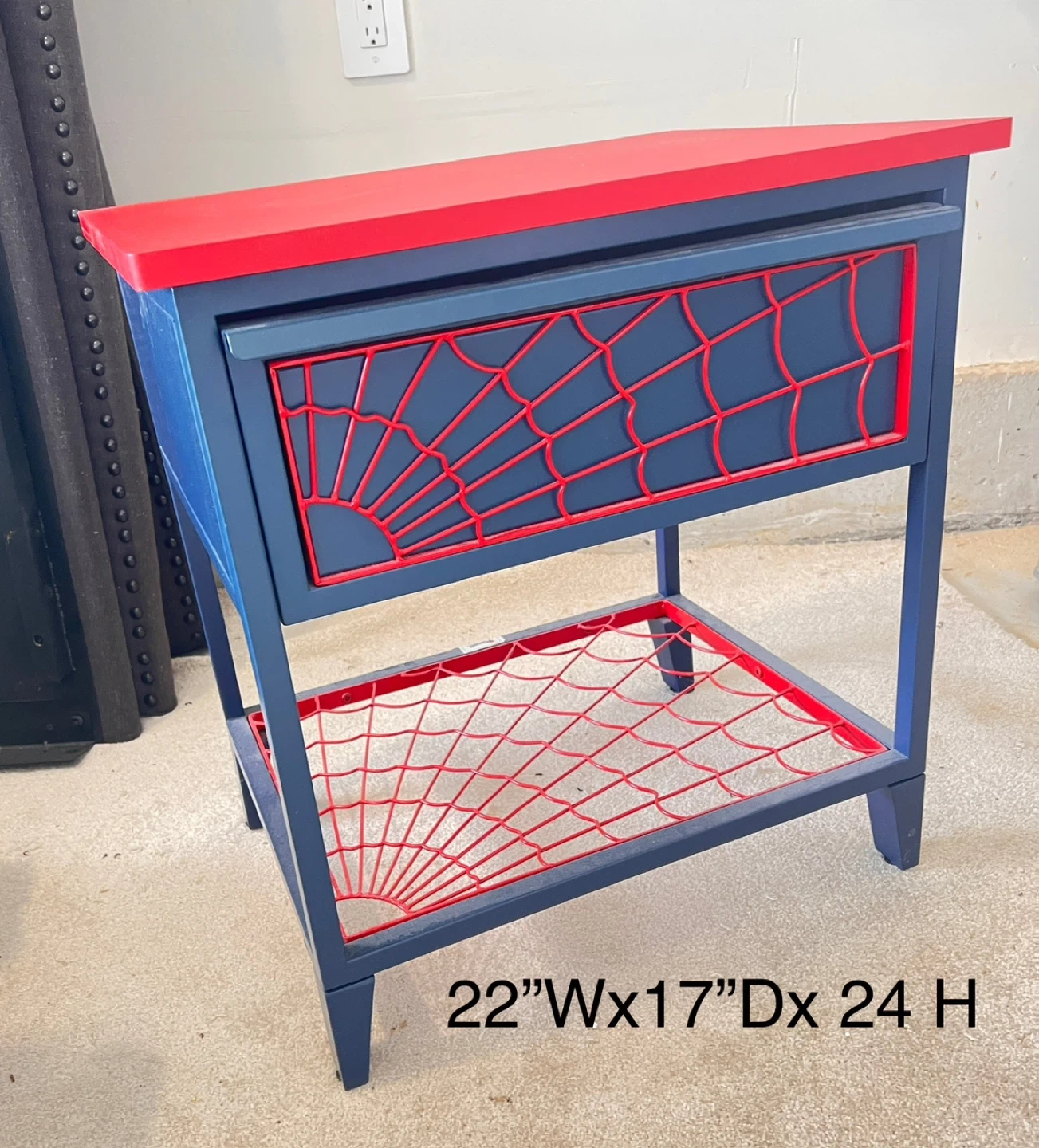 Check out this unique Spider-Man inspired nightstand! It features a cool red and blue colour scheme with a web design on the drawer and bottom shelf. The dimensions are 22" wide, 17" deep, and 24" high. Perfect for a kid's room or any Marvel fan!