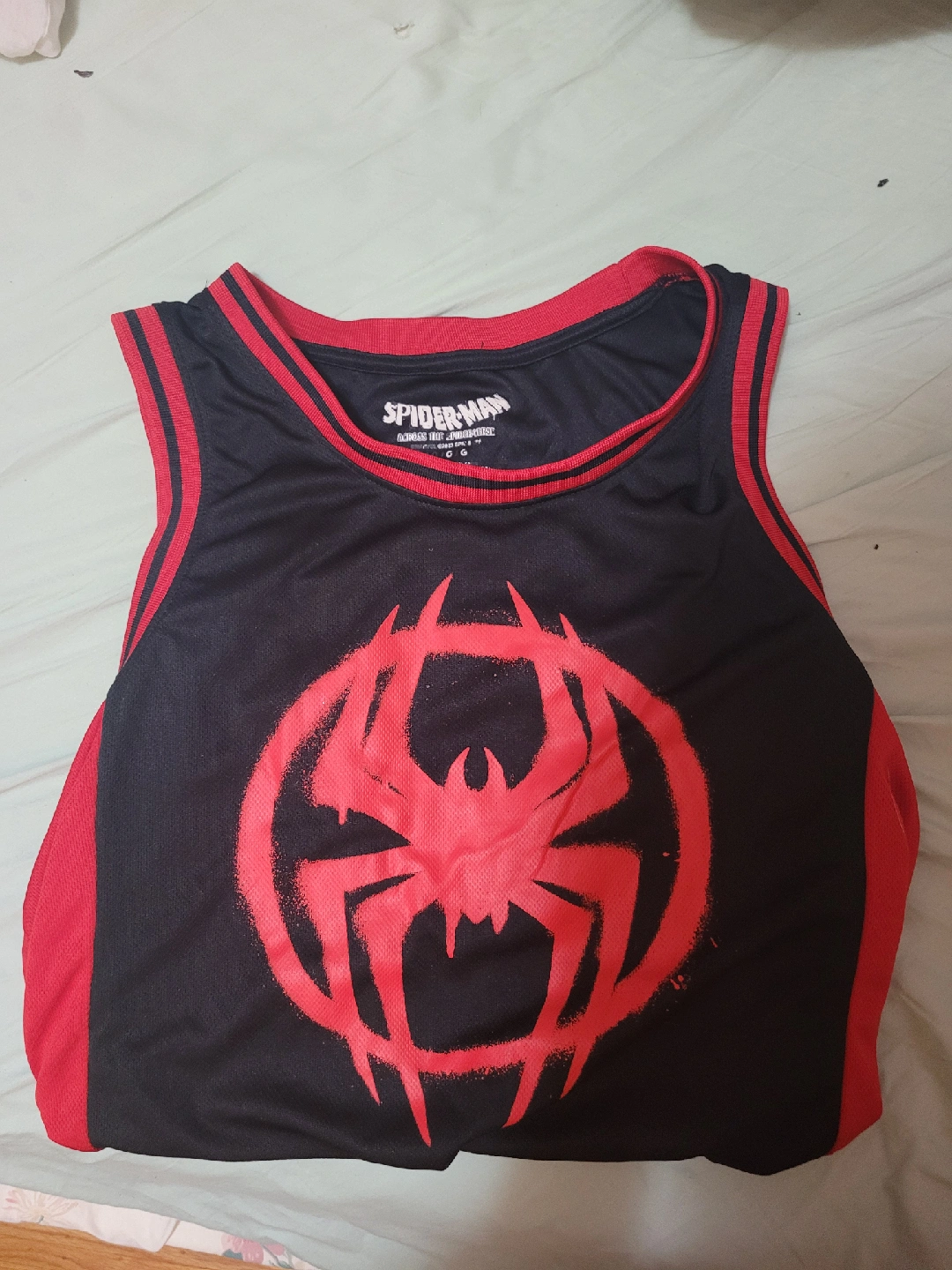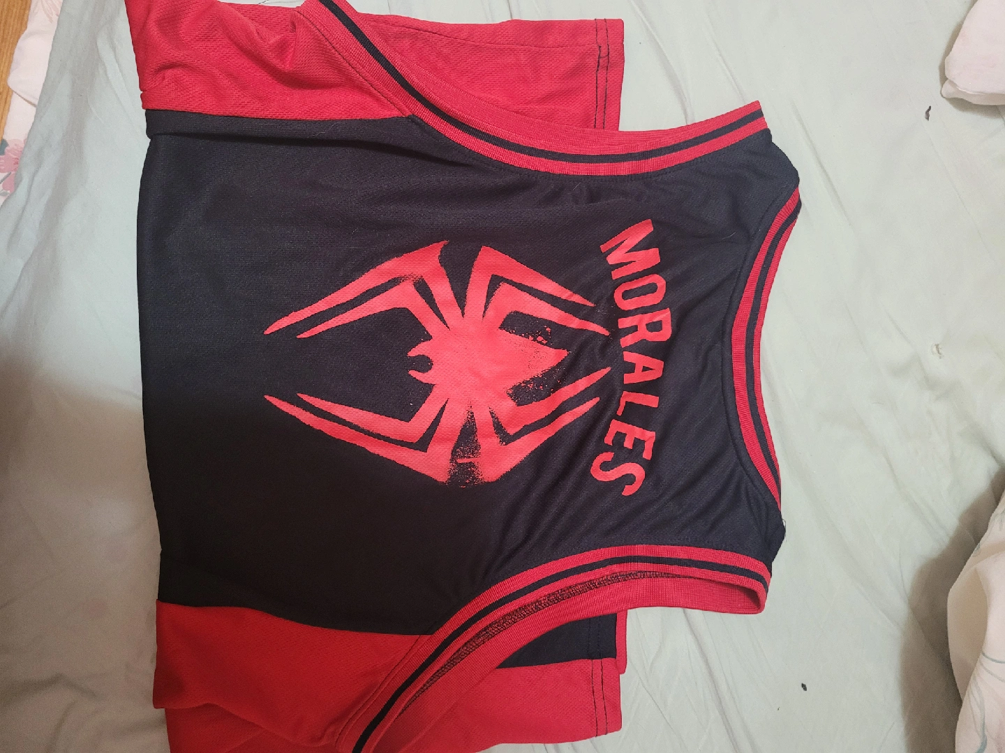 Selling a Spiderverse Spider-Man Miles Morales jersey! It's a size L and features a cool red and black design with the Spider-Man logo on the front and "Morales" on the back. Bought from hot topic