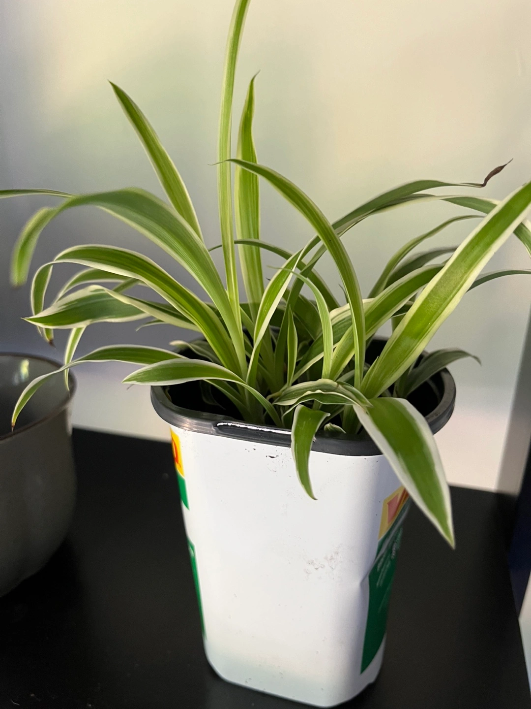 Here's a spider plant in a white pot! It's a great way to bring some greenery into your home.