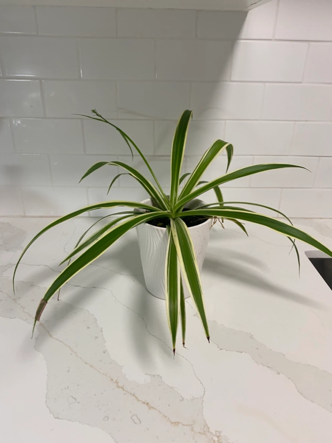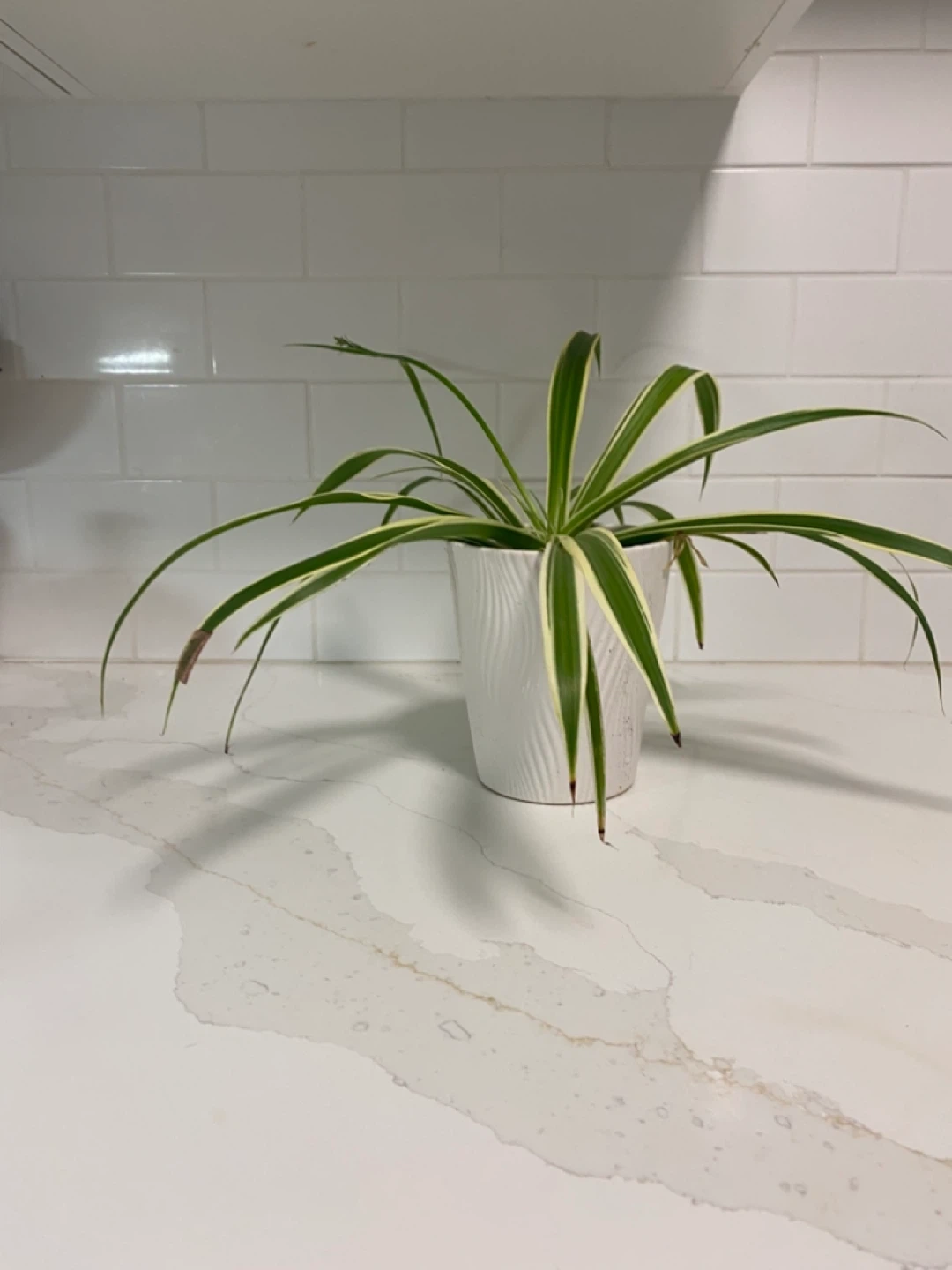 Selling a healthy spider plant in a white pot! It's a great way to add some greenery to your home. It's easy to care for and can thrive in various conditions.