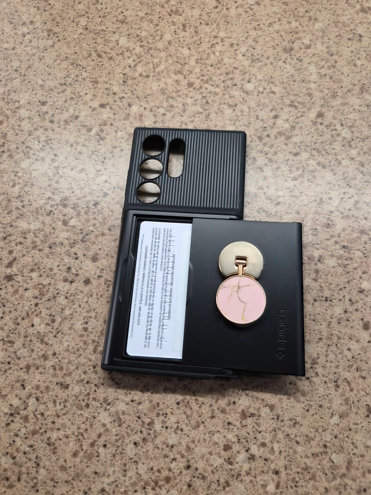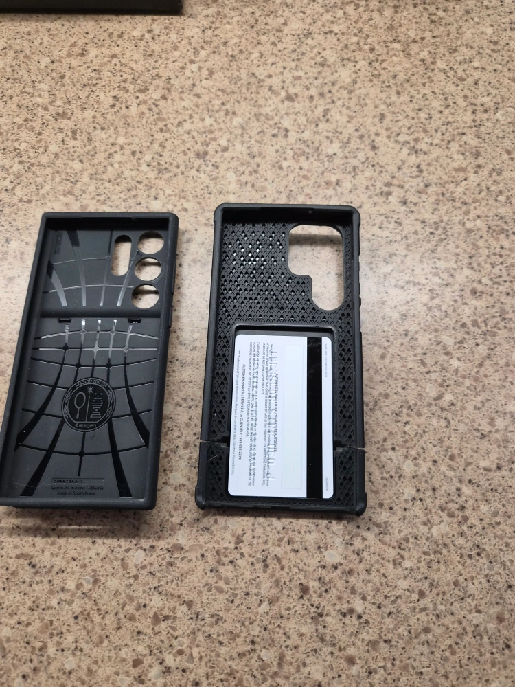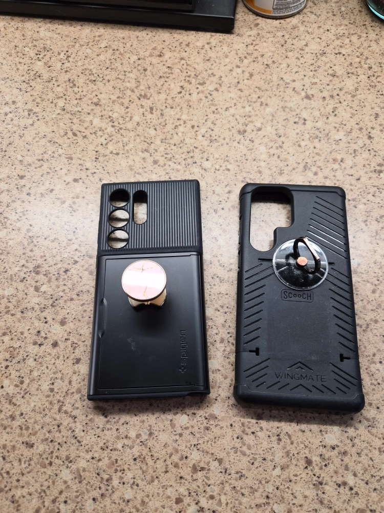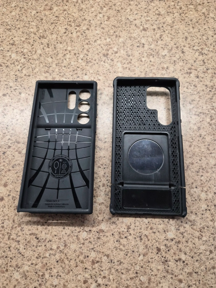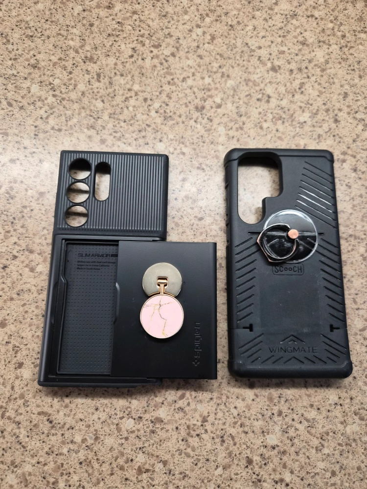Selling a couple of phone cases that fit a Samsung s23 ultra phone. One is a Spigen and the other is a Scooch Wingmate. Both are black and in great shape! Both have hidden card slots and ring holders