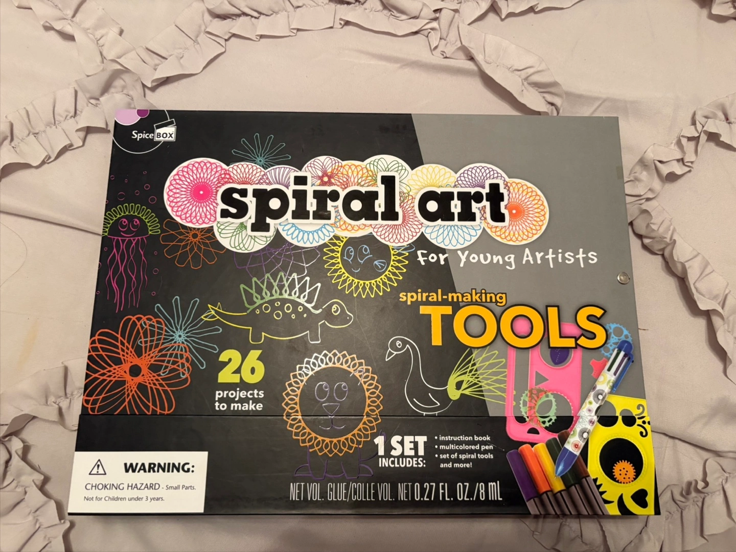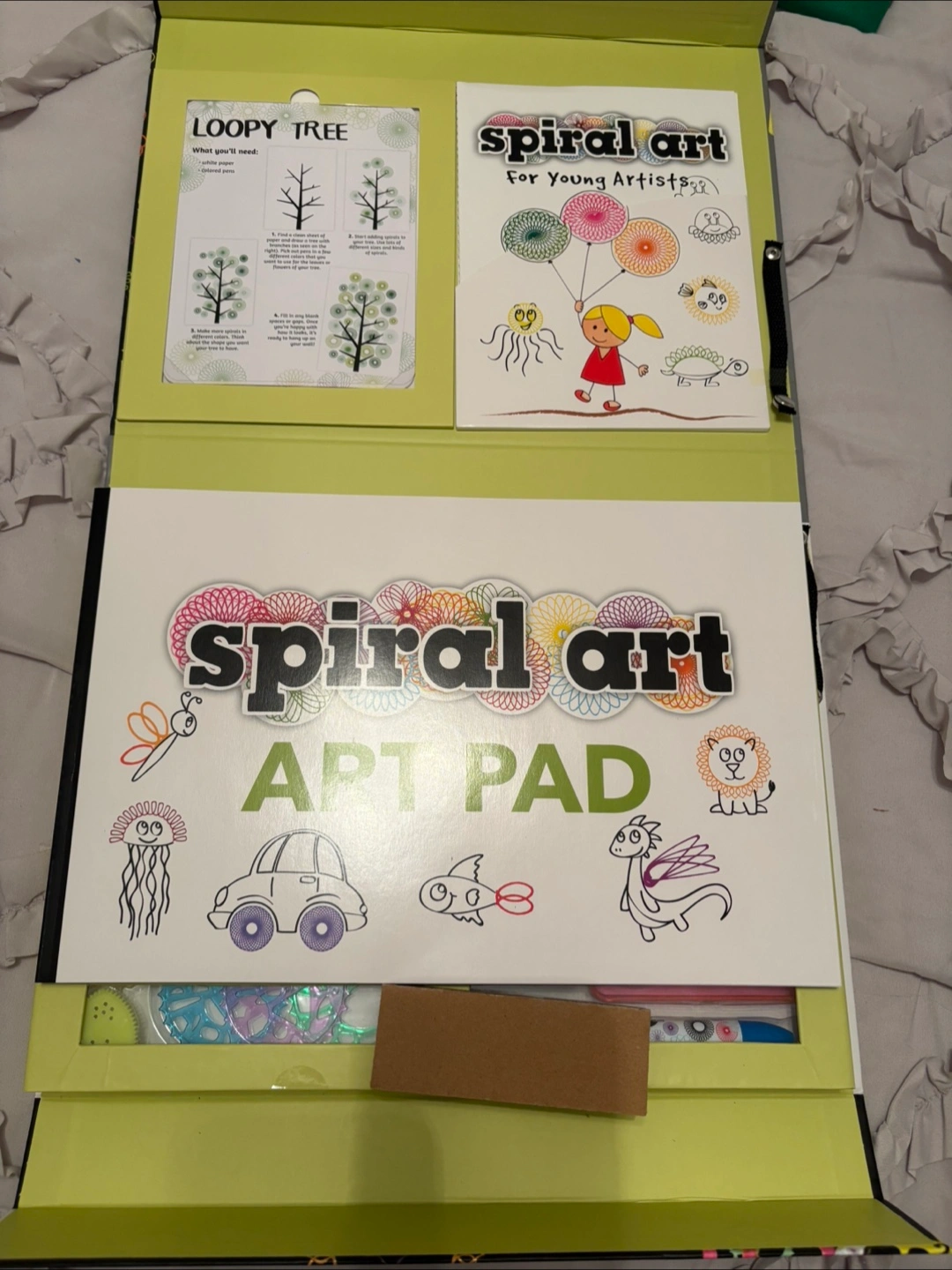 Selling a Spiral Art for Young Artists kit! It includes an instruction book, multicoloured pens, and a set of spiral tools. Great for young artists to explore their creativity!