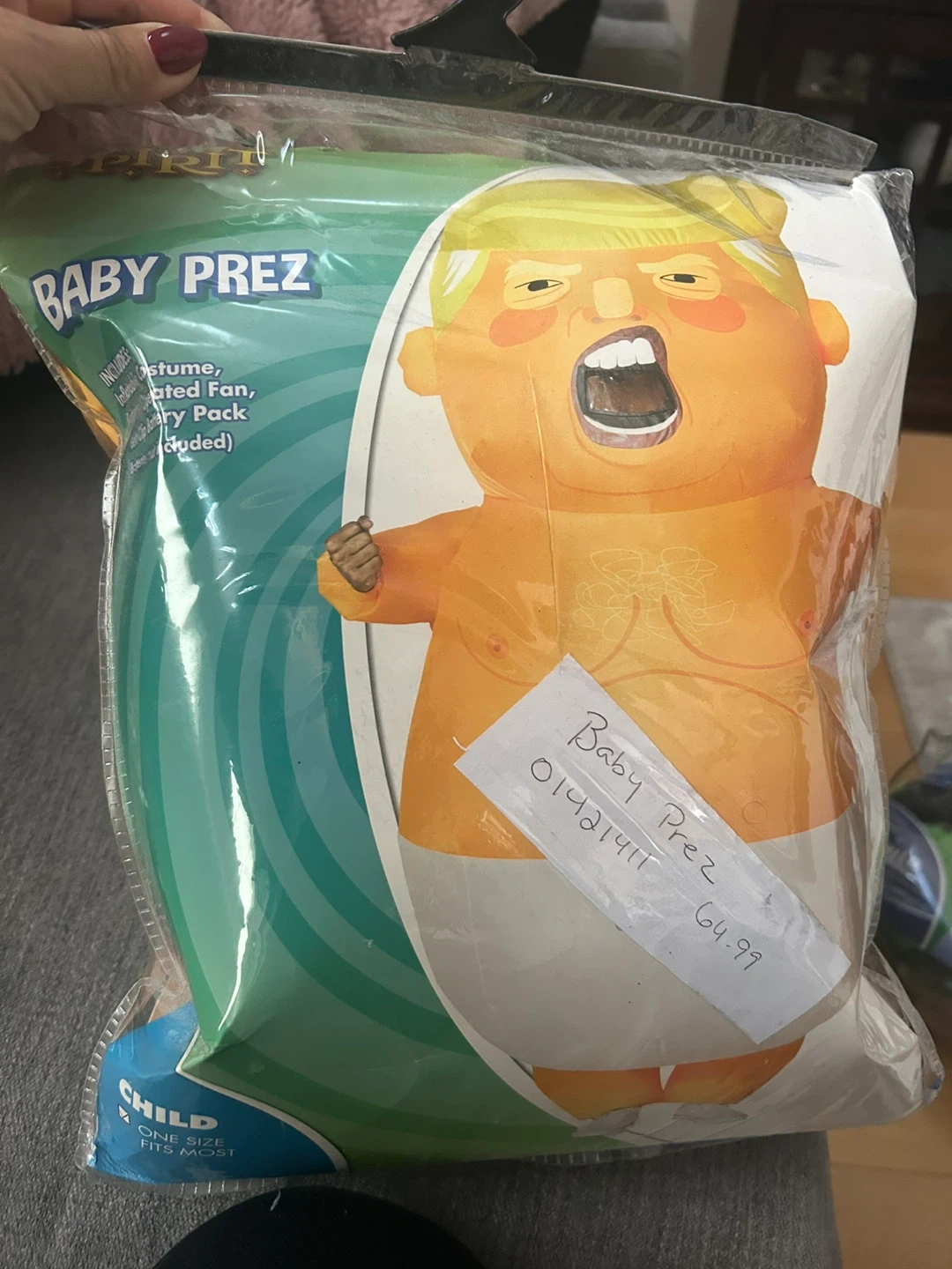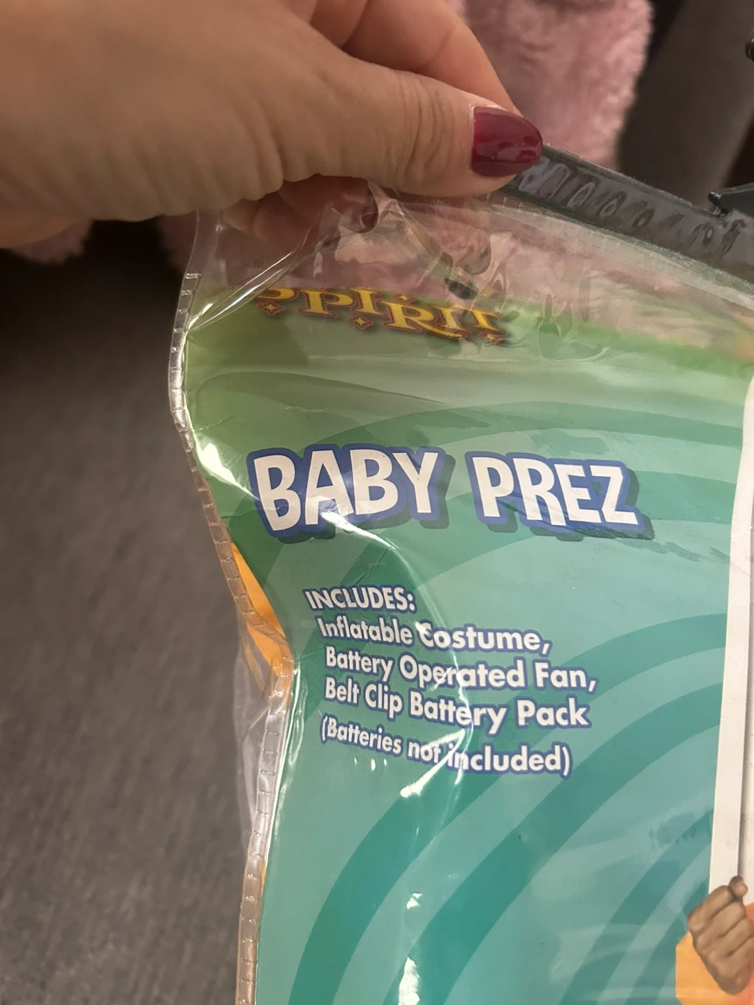 Get ready for Halloween with this hilarious Spirit Halloween Baby Prez inflatable costume! It includes the inflatable costume, a battery-operated fan, and a belt clip battery pack (batteries included). It's a child size, one size fits most. Originally bought for $64.99