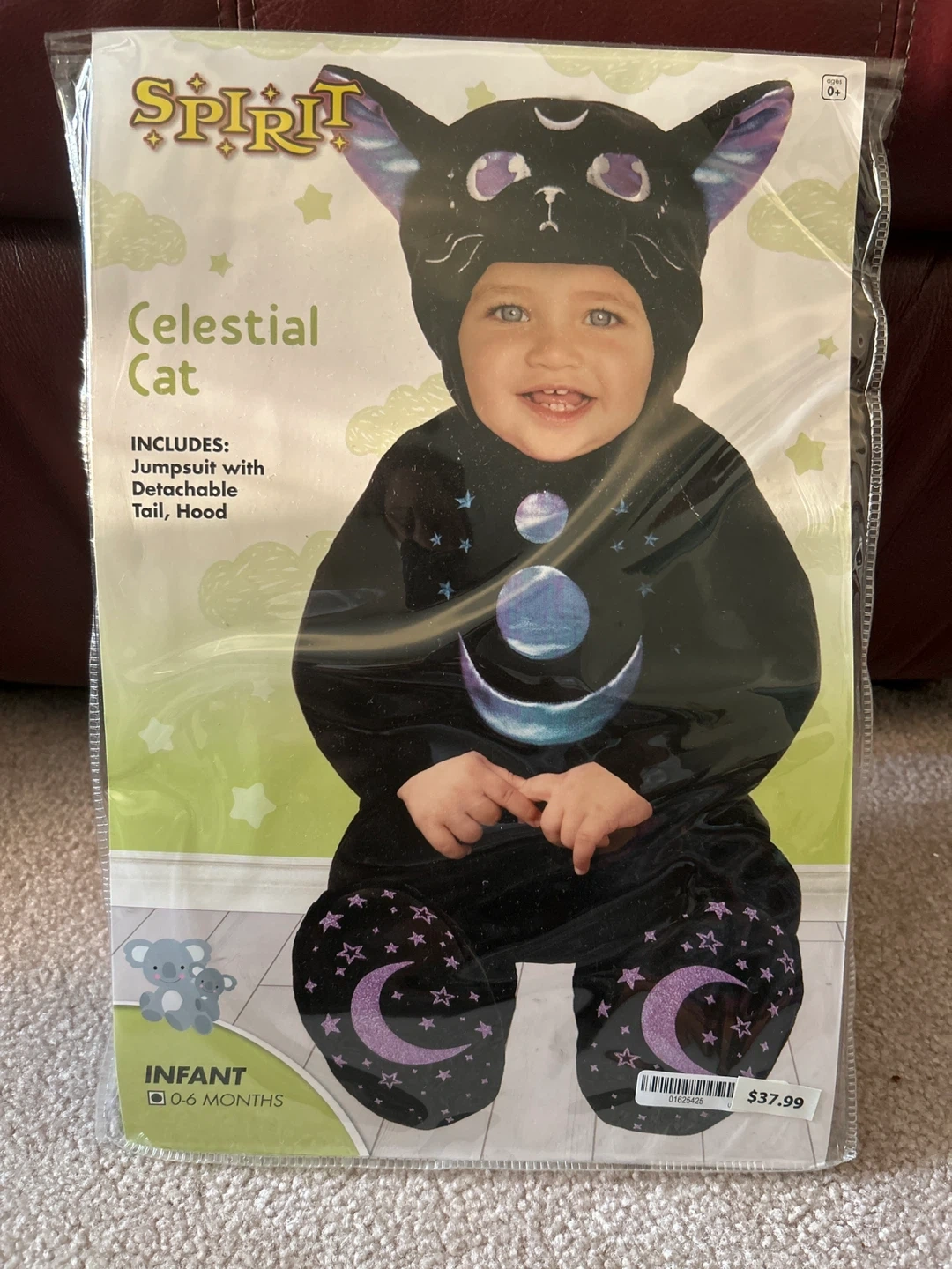 Selling a Spirit Halloween Celestial Cat costume for infants! It's in great condition and includes the jumpsuit with a detachable tail and hood. It's sized for 0-6 months. Originally bought for $37.99