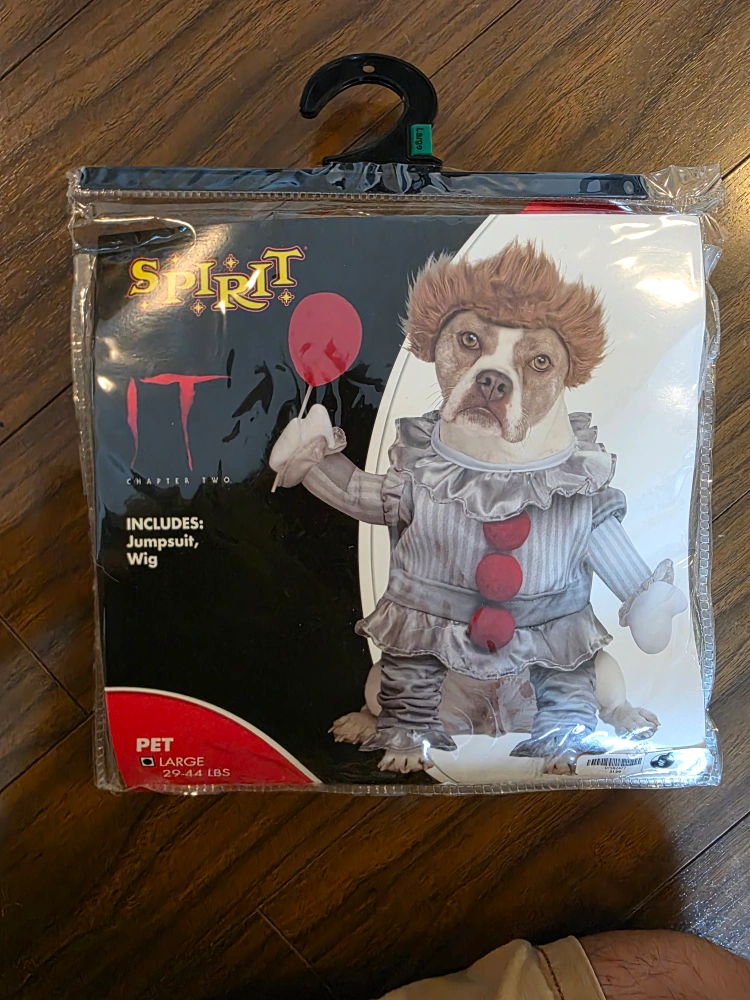 Get your pup ready for Halloween with this adorable IT costume! It's a size large, suitable for pets weighing 20-44 lbs. Includes the jumpsuit and wig to complete the look!