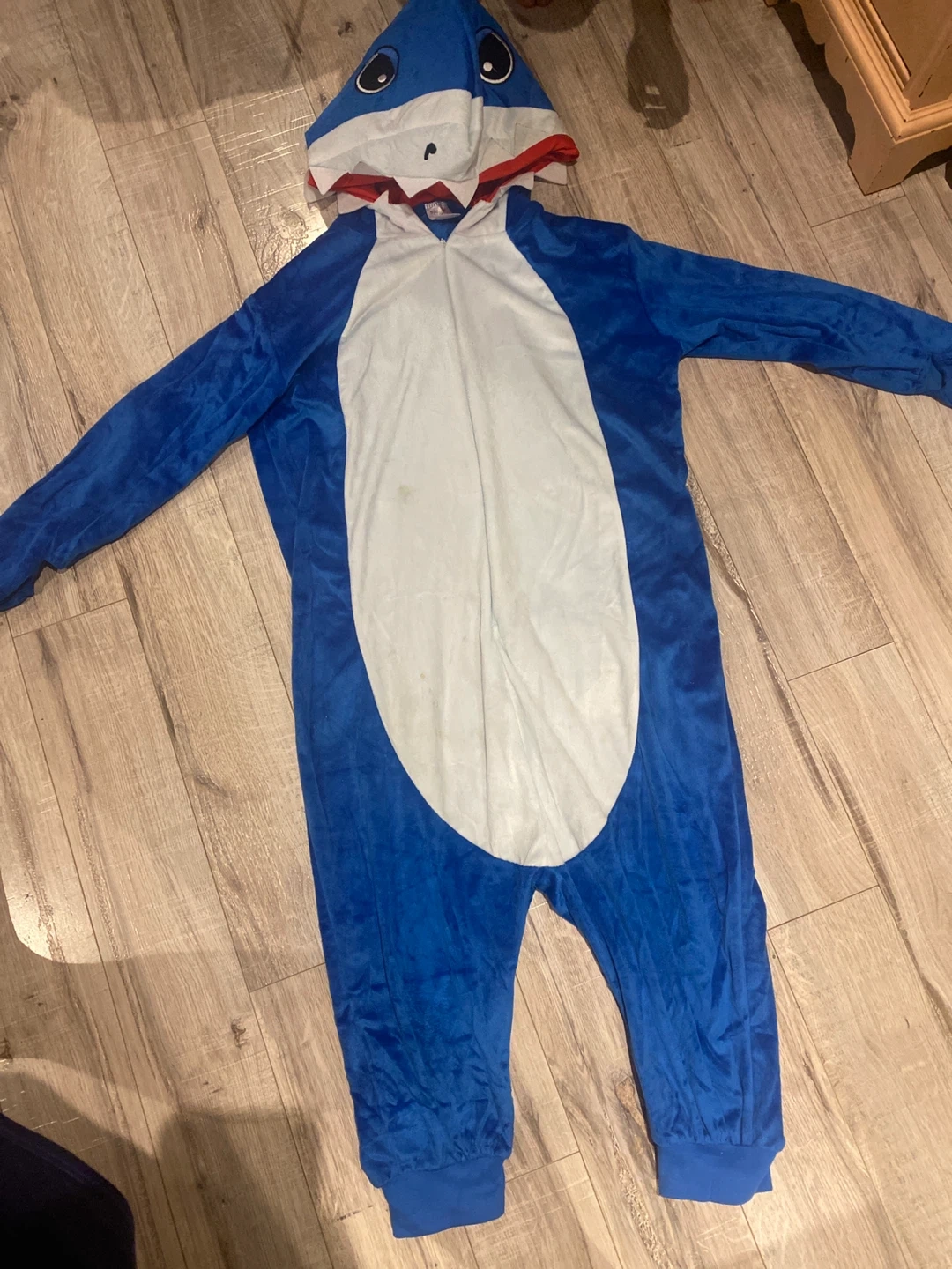 Selling a Spirit Halloween shark costume for kids! It's a size Small/Medium and includes the hooded plush jumpsuit. Perfect for Halloween or dress-up!