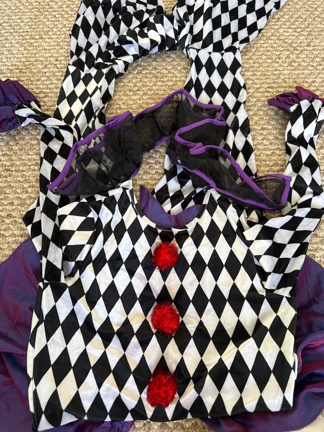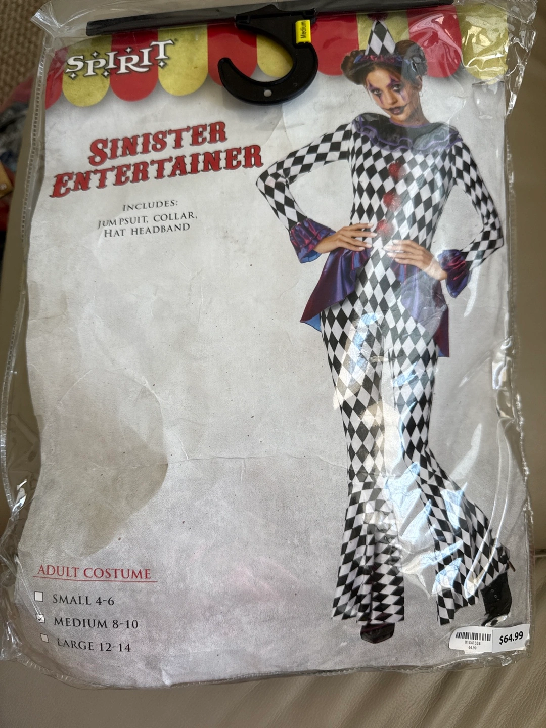Get ready for Halloween with this Sinister Entertainer costume from Spirit Halloween! This adult costume includes a jumpsuit, collar, and hat headband. It's a size Medium (8-10). Originally bought for $64.99!
