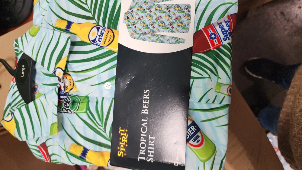 Get ready for summer with this fun tropical beers shirt from Spirit Halloween! It's a size large and features a colourful design with various beer bottles and palm leaves. Perfect for a party or just lounging around!